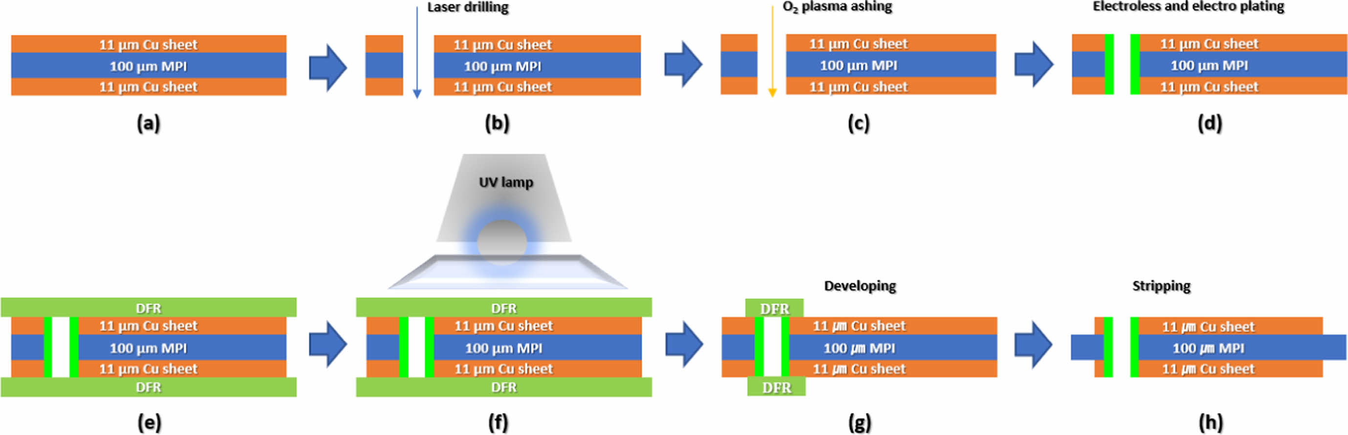 Schematic of via drilling and patterning process: (a) CCL manufactured by lamination process; (b) laser drilling; (c) O2 plasma ashing; (d) electroless and electroplating; (e) DFR coating; (f) patterning; (g) developing; (h) Cu etch and stripping.