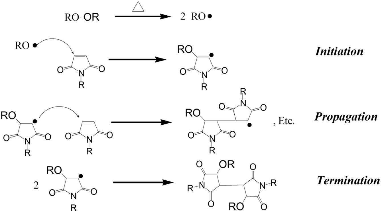 Figure 4는 MPI ink의 경화 메커니즘을 나타낸 그림이다. 저온 경화를 위해 투여된 peroxide는 가열에 의해 라디칼을 생성하며, 이 생성된 라디칼은 이미드 단량체 구조의 C=C 이중 결합으로 이동하여 개시 반응(initiation)이 시작된다.24 이때, C=C 이중 결합이 C-C 단일 결합이 되면서 추가로 생성된 라디칼이 다른 이미드 단량체의 C=C 이중 결합으로 이동하여 성장반응(propagation)이 진행된다. 마지막으로 두개의 성장 중이던 라디칼끼리 결합(coupling)하여 전자쌍을 이루어 반응이 종결(termination)된다.