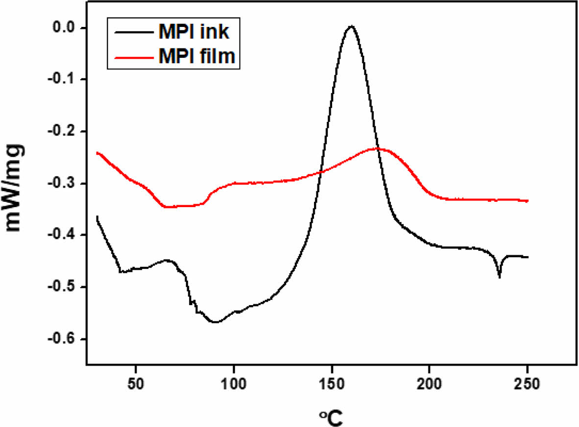 저온 경화 특성을 검증하기 위한 DSC 분석 결과를 Figure 5에 나타냈다. MPI ink는 저온에서 용제가 증발하여 흡열 peak이 나타나는 것을 알 수 있으며, MPI film은 경화된 상태라 별도의 peak 변화가 없었다. 200 ℃ 미만에서 MPI ink는 발열 peak이 발생하며, 기존의 폴리이미드보다 저온에서 반응하는 것을 알 수 있다. 추가로 MPI ink의 240 ℃ 부근에서 흡열 peak이 나타나는데, 이는 폴리이미드 구조에 내포된 다이아민의 증발로 나타난 것이다.25