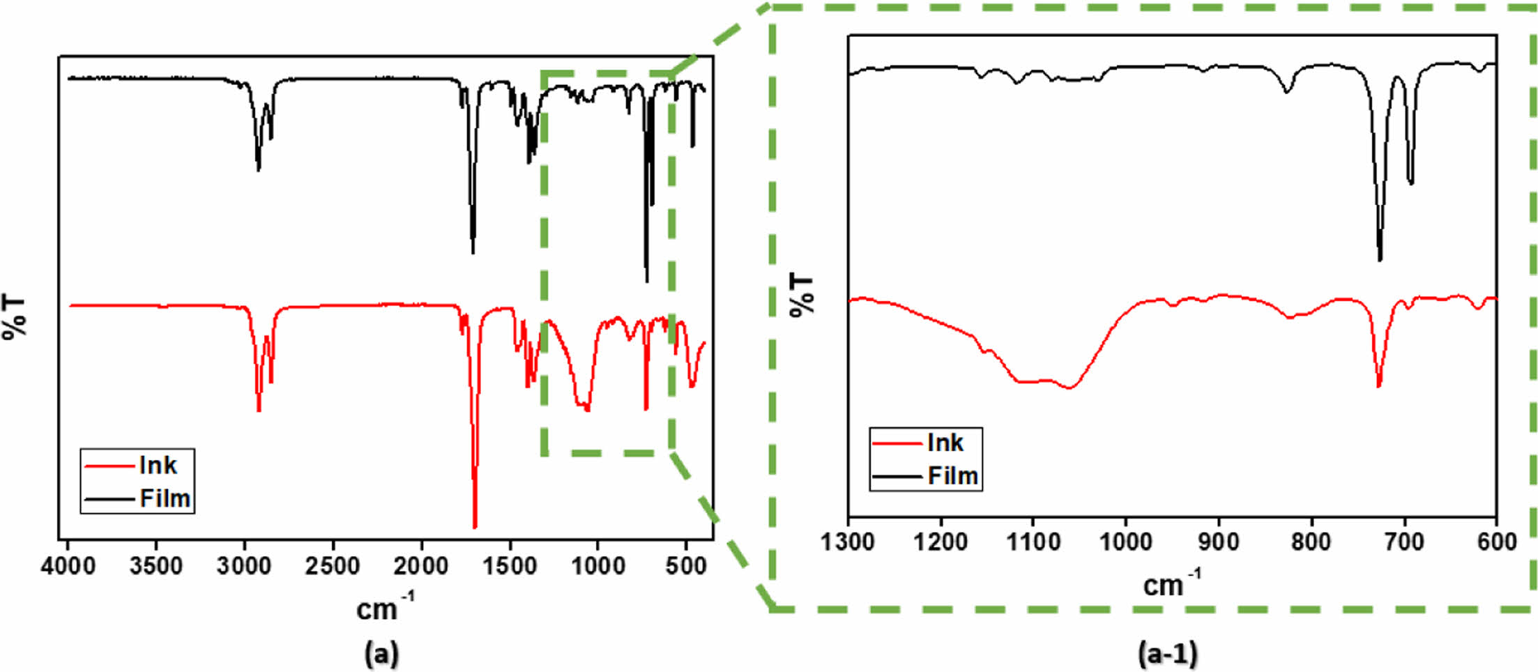 (a) FTIR results of MPI ink and film; (a-1) enlarged results.