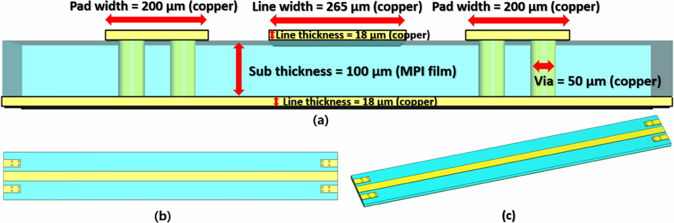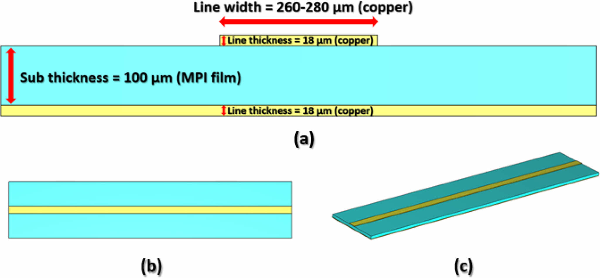 Schematic of transmission line for impedance matching: (a) cross-section; (b) above; (c) diagonal