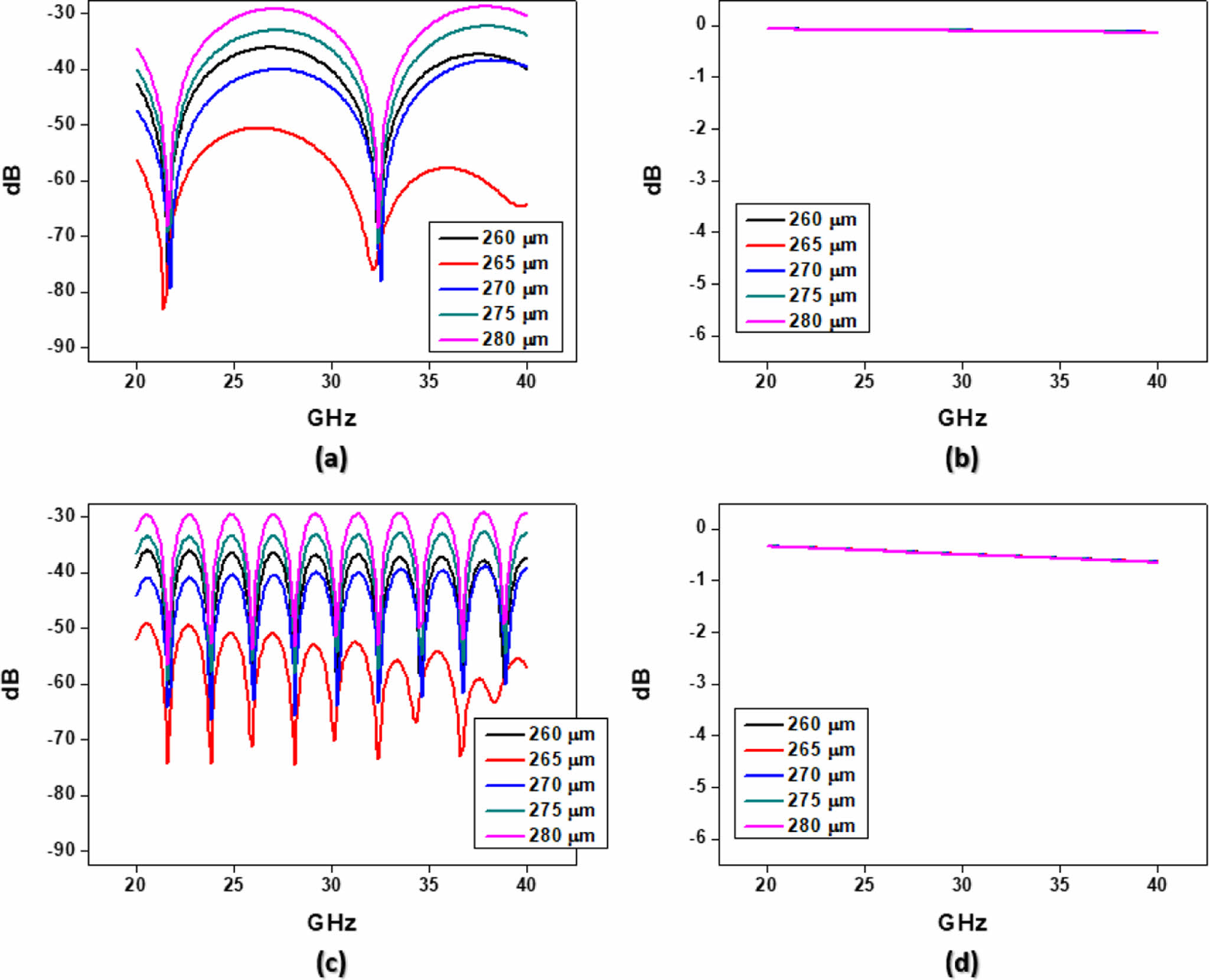 위의 MPI film의 유전율과 유전손실 결과를 바탕으로 전송선로를 설계하였으며, 그 구조를 Figure 8로 나타냈다. 260-280 μm의 선폭 중 가장 우수한 임피던스 매칭을 나타내는 선폭을 확인하기 위해 signal line의 길이를 1 cm로 설정하여 경향 파악을 위한 시뮬레이션을 진행하였다. 그 결과를 Figure 9로 나타냈고, S11에서 265 μm의 선폭이 가장 낮은 손실을 보이면서 임피던스 매칭이 가장 잘 되는 것을 확인하였다. Figure 9(c-d)는 signal line의 길이를 5 cm로 증가시킨 후에 동일하게 시뮬레이션을 진행한 결과를 나타냈으며, 265 μm의 선폭이 가장 우수했다. 실제 샘플과 유사하게 signal line 옆에 ground와 via로 연결된 pad를 삽입하여 Figure 10과 같은 구조로 시뮬레이션을 진행하였다. 각 pad당 via 개수는 4개로 설정하였는데, 그 이유는 도금공정으로 via filling을 통한 ground와 pad의 전기적 연결 성능의 증폭을 위해서다.