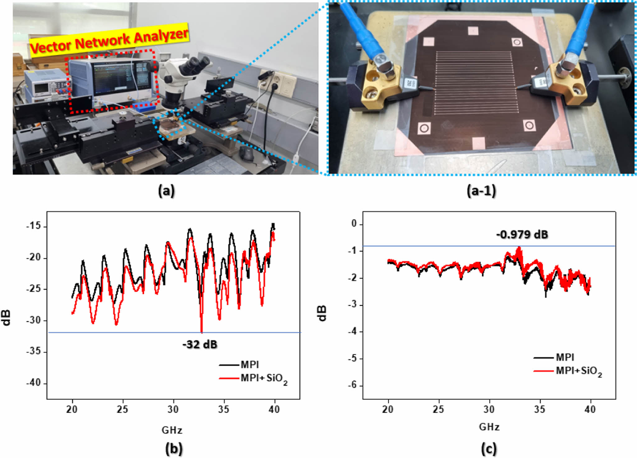 개발된 MPI film들을 향후 안테나 또는 전송선로와 같은 RF 소자나 첨단 소재에 적용 가능성을 검증하기 위해 전송선로를 제작하여 s파라미터 분석을 통해 유전체 특성을 검증하였다. 유전층을 MPI만 사용한 CCL과 MPI와 다공성 실리카를 혼합하여 제작된 CCL로 제작된 전송선로들을 Figure 12와 같이 VNA로 stage 위에 위치시키고, 주파수는 앞의 시뮬레이션과 같이 20-40 GHz 범위에서 S11과 s21 측정을 진행하였다. 먼저 S11의 경우 입/출력 포트가 같아 신호 송신 후 출력되는 값으로 자체적 반사 값(reflection)을 의미하며, 값이 낮을수록 우수한 특성을 의미한다. MPI로 제작된 전송선로의 S11 평균 값은 약 -21.57 dB이며, 최소 값은 약 -26.4 dB이다. 실리카가 포함된 MPI로 제작된 전송선로의 S11 평균 값은 약 -23.03 dB이며, 최소 값은 약 -32 dB로 각각 약 7%, 21% 감소한 결과를 보였다. 다음으로 S21은 입력 포트 대비 출력포트의 비로써 입력신호가 최소한의 손실(transmission)로 출력되는 것을 의미하며, 0에 가까울수록 손실이 적은 것을 의미한다. MPI 전송선로의 S21은 평균 약 -1.7 dB, 최소 값은 약 -0.8 dB로 측정되었다. 실리카가 포함된 MPI 전송선로의 S21의 평균 값은 약 -1.6 dB이며, 최소 값은 약 -0.979 dB로 각각 약 5%, 18.4% 감소한 결과를 보였다. 전반적으로 실리카가 포함된 유전층은 유전율과 유전손실이 감소함으로써 s파라미터 특성이 개선된 결과를 나타냈고 전송선로를 통해 그 특성을 증명하였다.