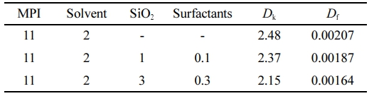 Table 1은 유연하고 내열성이 우수한 저온 경화형 PI film 제조 공정에 사용된 PI ink의 포뮬레이션이다. 저온 경화 특성을 부여하기 위해 PI ink와 과산화물을 10:1의 배합비로 혼합하여 modified polyimide(MPI) ink를 만들었다. MPI ink의 용매로는 지방족 화합물 용해에 적합하고 휘발성이 우수한 anisole(Duksan General Science Co., Korea)을 사용하였다. 저온 경화형 MPI의 저유전 특성을 부여하기 위해 다공성 실리카(25P1500-21H25, Anhui Triumph Base Material Technology Co., Ltd., China)를 혼합하였다. 다공성 실리카 구조상 존재하는 내부 공극은 공기가 포함되어 유전율과 유전손실을 감소시킬 수 있다. 그러므로 다공성 실리카의 적정한 혼합 함량을 산출하기 위해 3가지 포뮬레이션으로 유전율과 유전손실 변화를 측정하였다.