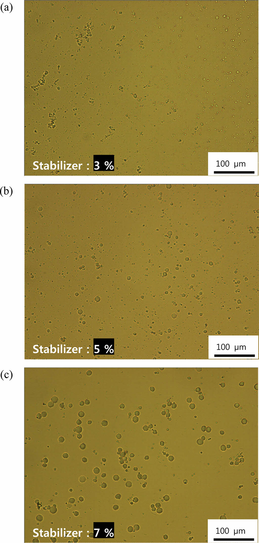 Optical microscope images of P(AA-co-GelMA) hydrogel particles synthesized using various concentrations of the stabilizer: (a) stabilizer 3%; (b) stabilizer 5%; (c) stabilizer 7%.