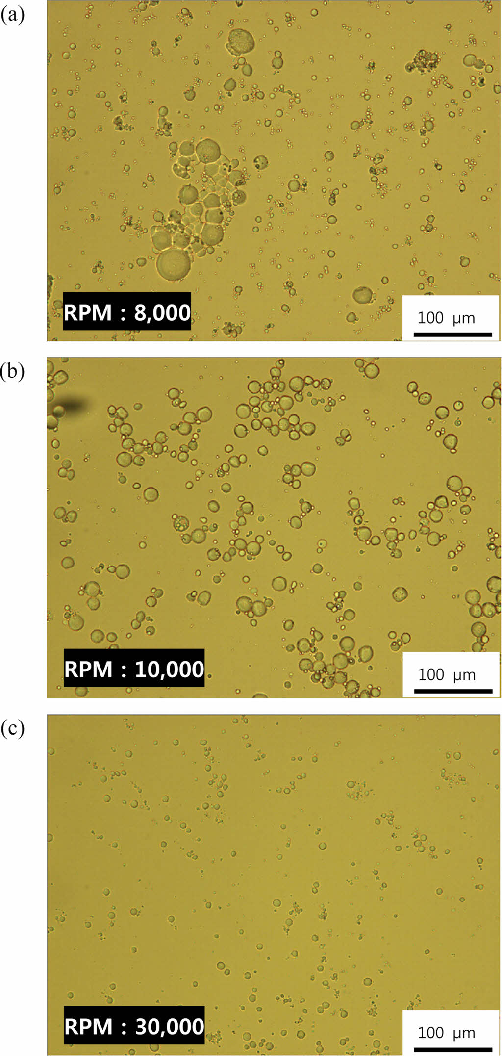 Optical microscope images of P(AA-co-GelMA) hydrogel particles synthesized using various stirring speed (rpm): (a) 8000 rpm; (b) 10000 rpm; (c) 30000 rpm.
