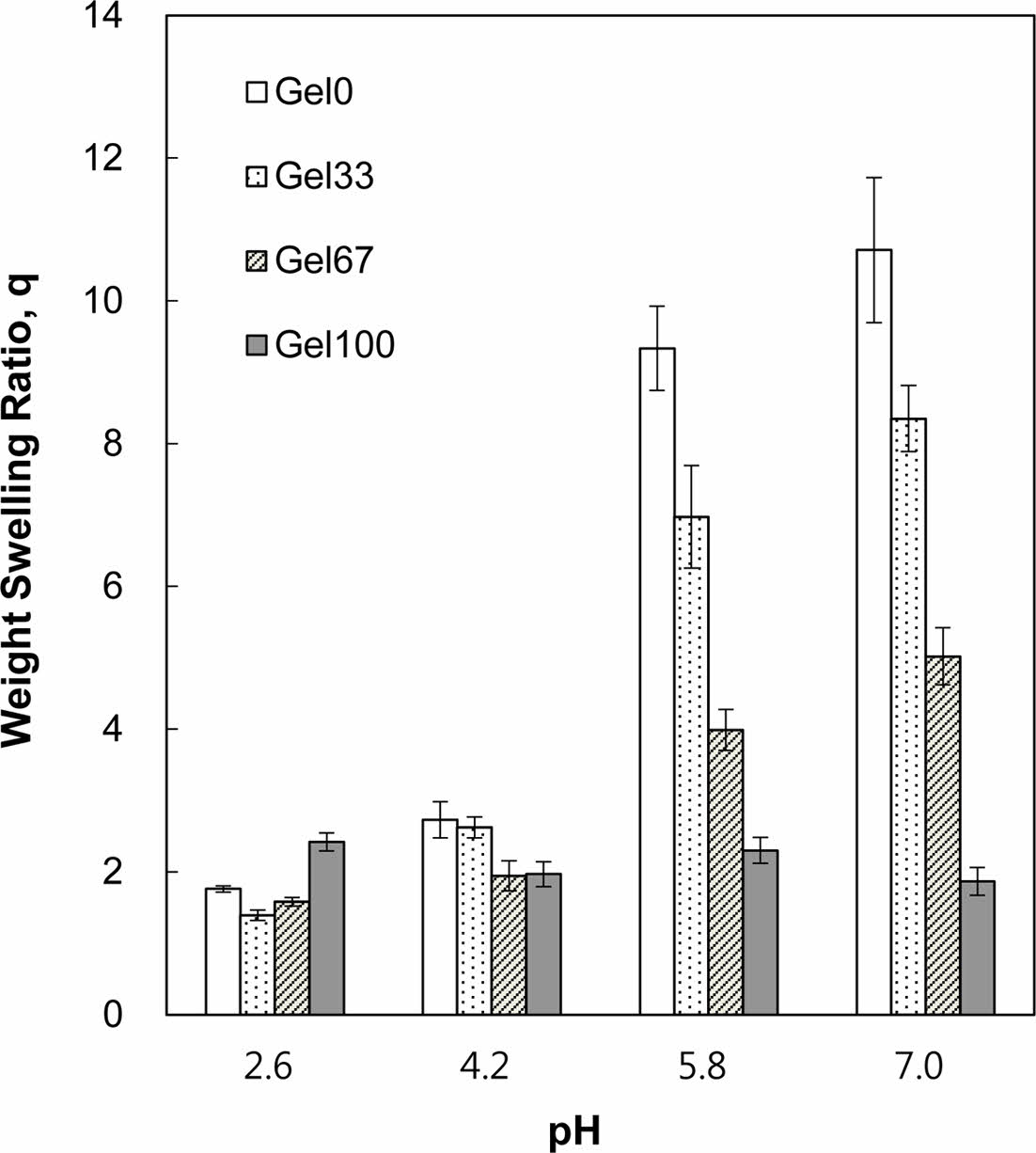 P(AA-co-GelMA) 수화젤 입자의 팽윤 평가. P(AA-co-GelMA) 수화젤 입자의 pH 감응성 팽윤거동을 평가하기 위하여 건조된 수화젤 입자의 중량을 측정한 후, pH 2.6에서 7.0 사이의 범위에서 제조한 완충용액에 투입하여 팽윤시키고, 24시간 경과 후 여과를 통해 입자를 완충용액으로부터 분리하여 중량을 측정하였다. 중량 팽윤비(q)는 건조 수화젤 입자의 중량에 대한 팽윤 수화젤 입자의 중량의 비로 계산하였다.
