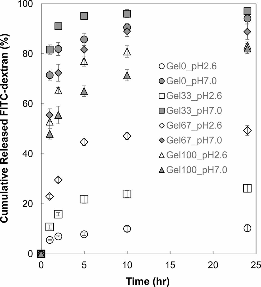 P(AA-co-GelMA) 수화젤 입자의 pH 감응성 방출거동. P(AA-co-GelMA) 수화젤 입자로부터 약물의 pH 감응성 방출거동을 조사하기 위해 모델물질로 FITC-dextran를 선정하여 수화젤 입자에 탑재하였다. 수화젤 입자에 탑재된 FITC-dextran이 수화젤에 내부에서 외부로 방출되는 정도는 수화젤의 팽윤 정도와 밀접한 관계가 있다. FITC-dextran이 탑재된 P(AA-co-GelMA) 수화젤 입자를 pH 2.6 및 pH 7.0 완충용액에 넣고 시간이 경과함에 따라 P(AA-co-GelMA) 수화젤 입자에서 방출된 FITC-dextran의 누적 방출량을 측정하여 Figure 5에 나타내었다. AA가 포함되는 않은 Gel100을 제외한 P(AA-co-GelMA) 수화젤 입자들은 pH 차이에 따른 방출거동을 보여주었다. pH 2.6에서는 미량의 FITC-dextran이 수화젤 입자로부터 방출된 반면, pH 7.0에서는 상대적으로 많은 양의 FITC-dextran이 수화젤 입자로부터 방출되었다. 이러한 이유는 앞서 팽윤거동에서 설명한 바와 같이, 젤라틴 100%로 구성된 수화제인 Gel100 수화젤의 경우 외부 pH에 감응할 수 있는 AA 그룹이 없으므로 pH에 따른 방출거동이 나타나지 않은 반면, AA를 포함한 P(AA-co-GelMA) 수화젤 입자들은 pH 변화에 따라 AA 그룹이 이온화되면서 pH 감응성 방출거동을 보여준 것이다. pH 2.6과 7.0에서 P(AA-co-GelMA) 수화젤 입자로부터 방출되는 FITC-dextran의 pH에 따른 차이를 정량화하기 위해서 24시간 동안 pH 7.0에서 방출된 FITC-dextran의 누적 방출량과 pH 2.6에서의 누적 방출량을 비교하여 Table 2에 정리하였다. P(AA-co-GelMA) 수화젤의 AA 함량이 증가함에 따라서 pH 7.0과 2.6 사이에서 방출된 FITC-dextran 차이가 증가하는 것을 볼 수 있는데, 이러한 pH 감응성 방출거동은 앞서 언급한 P(AA-co-GelMA) 수화젤의 pH 감응성 팽윤거동과 연관된 것으로, AA를 많이 함유한 P(AA-co-GelMA) 수화젤 입자일수록 pH 7.0에서 음이온을 띌 수 있는 AA가 많아서 더 많이 팽윤할 수 있고 따라서 더 많은 FITC-dextran이 수화젤로부터 방출되는 것이다. 이러한 P(AA-co-GelMA) 수화젤 입자의 pH 감응성 방출거동은 인체의 위장과 소장 사이의 pH 차이를 이용한 단백질약물의 경구 투여용 전달체를 구현하는데 있어서 유용하게 사용될 수 있다.