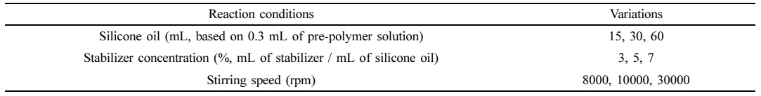 P(AA-co-GelMA) 수화젤 입자의 크기 및 분산성을 제어하기 위하여 분산안정제의 농도, 분산매(실리콘 오일)의 양, 그리고 교반속도 등 다양한 합성조건이 수화젤 입자의 크기와 분산성에 미치는 영향을 조사하였다. 분산안정제를 첨가하지 않고 중합을 하였을 경우, 수화젤 입자들 사이에 응집이 발생하는 것을 볼 수 있었다. 따라서 분산성을 향상시키기 위한 분산안정제로 2-methoxy(polyethyleneoxy) 6-9propyl heptamethyl trisiloxane을 사용하였다. Figure 1은 다양한 농도의 분산안정제를 사용하여 합성한 P(AA-co-GelMA) 수화젤 입자들을 촬영한 광학현미경 사진들이다. 분산안정제를 사용함에 따라 수화젤 입자의 응집이 전반적으로 적어지는 것을 볼 수 있었으며, 분산안정제 농도가 증가함에 따라 수화젤 입자의 크기는 증가하였다. Figure 2는 분산매인 실리콘 오일이 P(AA-co-GelMA) 수화젤 입자의 크기와 분산성에 미치는 영향을 나타낸 것인데, 실리콘 오일의 양이 증가할수록 수화젤 입자의 분산성이 향상되는 것을 볼 수 있었다. 그 이유는 분산매의 양이 증가함에 따라 수화젤 입자들이 합성되어졌을 때 분산할 수 있는 공간이 커지기 때문으로 설명할 수 있다. 그러나 실제적으로 실리콘 오일의 첨가량을 증가시키면 최종 입자를 얻기 위해 오일로부터 분리하는 세척 공정의 횟수가 증가하게 되고 세척 공정에서 손실되는 입자가 많아져서 최종 입자의 수율이 감소하였다. 교반속도가 P(AA-co-GelMA) 수화젤 입자의 크기와 분산성에 미치는 영향은 Figure 3에 나타내었다. 예상한 바와 같이 교반속도가 증가할수록 실리콘 오일 내 분산되는 단량체 방울들의 크기가 작게 되고 따라서 최종 입자의 크기가 더 작은 수화젤 입자를 합성할 수 있었다. 이러한 결과들을 정리하여 최종적으로 P(AA-co-GelMA) 수화젤 입자의 합성조건을 확립하였는데, 분산매인 실리콘 오일 30 mL, 분산안정제의 농도 5%, 그리고 교반속도 30000 rpm으로 결정하였고, 이러한 조건들을 사용하여 합성한 P(AA-co-GelMA) 수화젤 입자의 평균크기는 12.6 μm(± 1.5 μm)이었다.