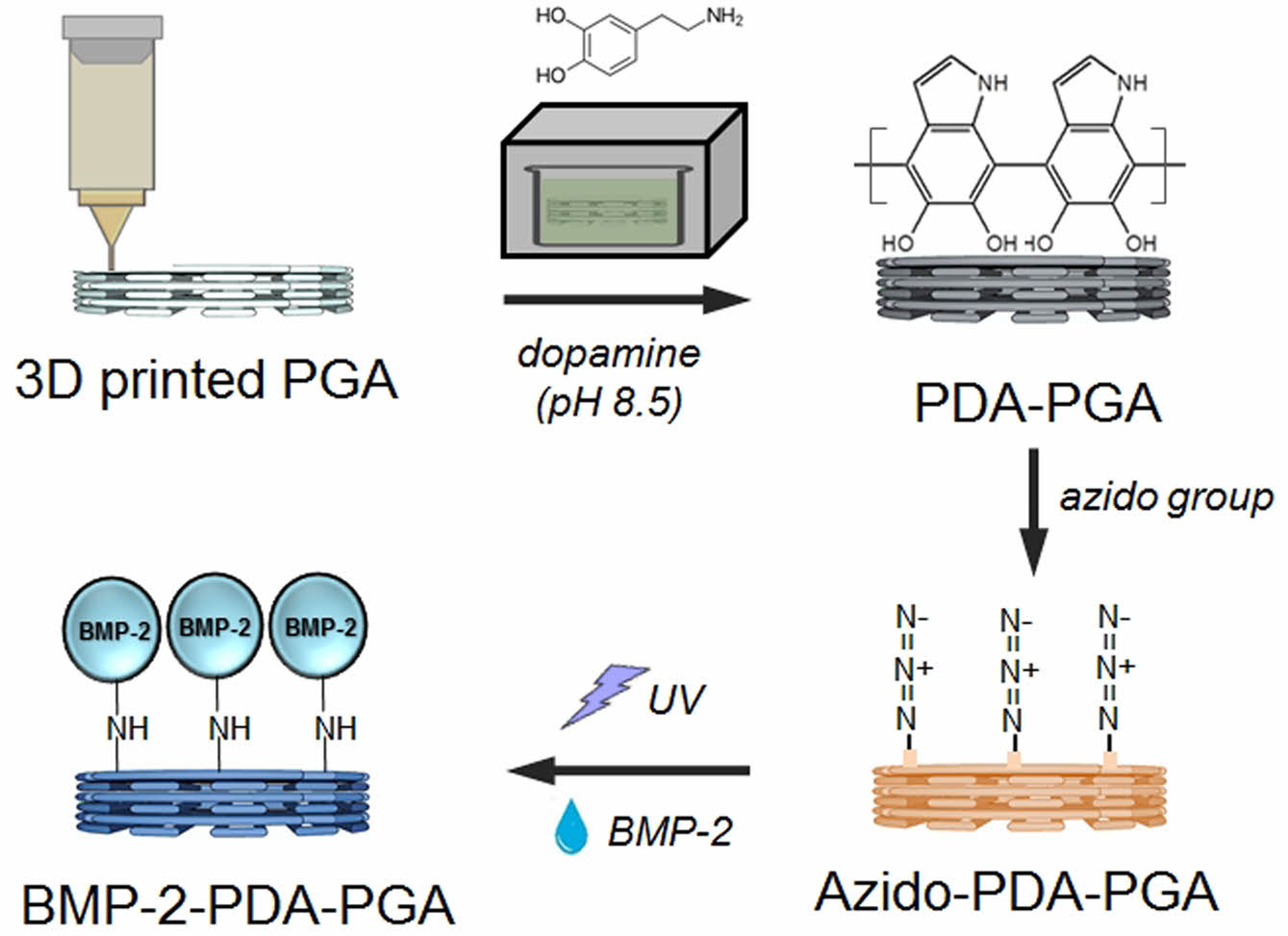 Figure 1 Fabrication schematic of a BMP-2 immobilized PGA scaffold. 3D printed PGA scaffold was modified with dopamine coating and azido group before immobilizing BMP-2 by UV irradiation. |