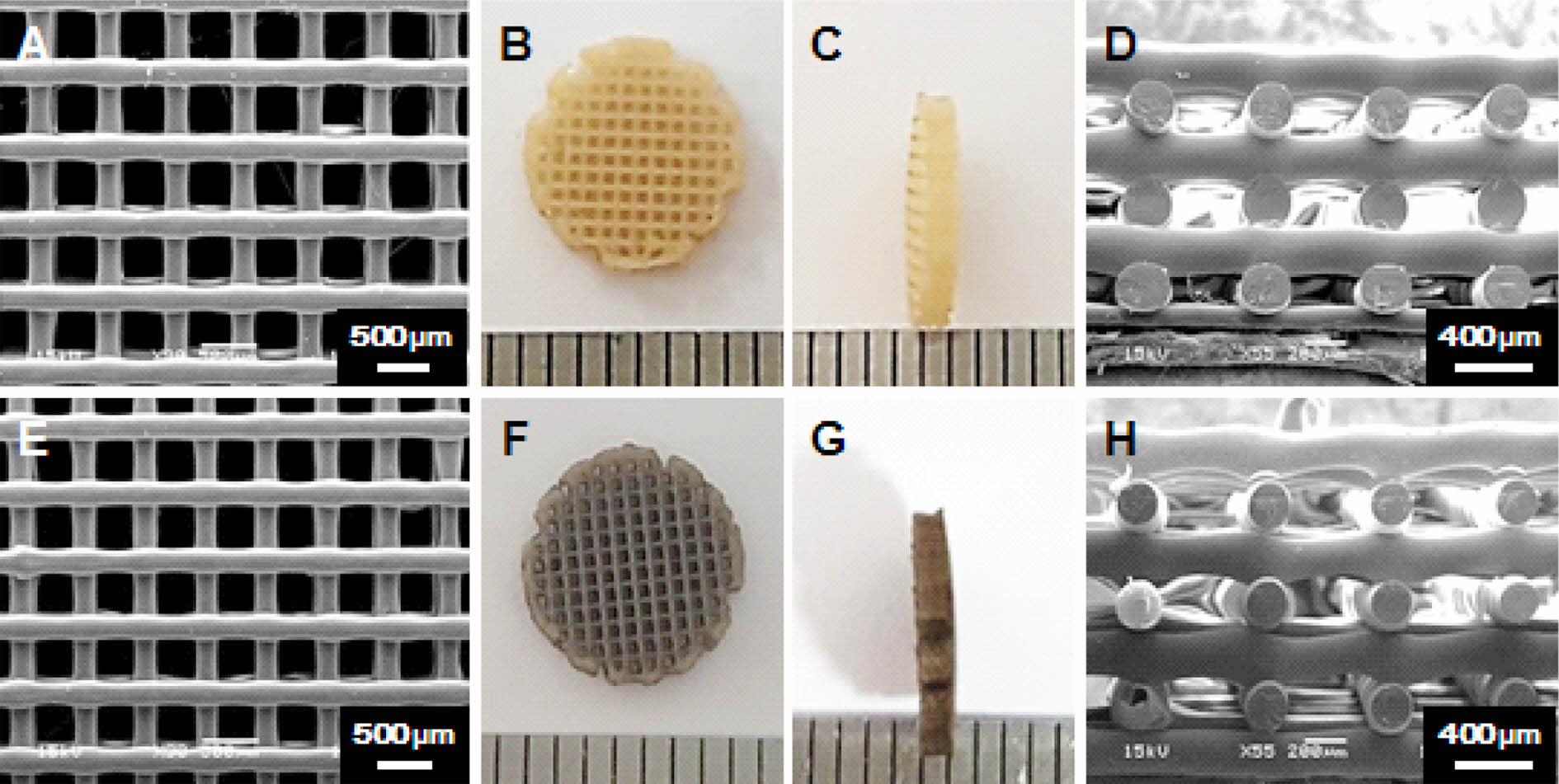 Figure 2 Photomicrographs of PGA (A-D) and dopamine coated PGA (E-H) scaffolds (A, B, E, F; top / C, G; side / D, H; cross section). Mean strand diameters and pore lengths of PGA and dopamine coated PGA scaffolds were 199 ± 36 μm, 400 ± 14 μm and 238 ± 20 μm, 359 ± 13 μm, respectively. |