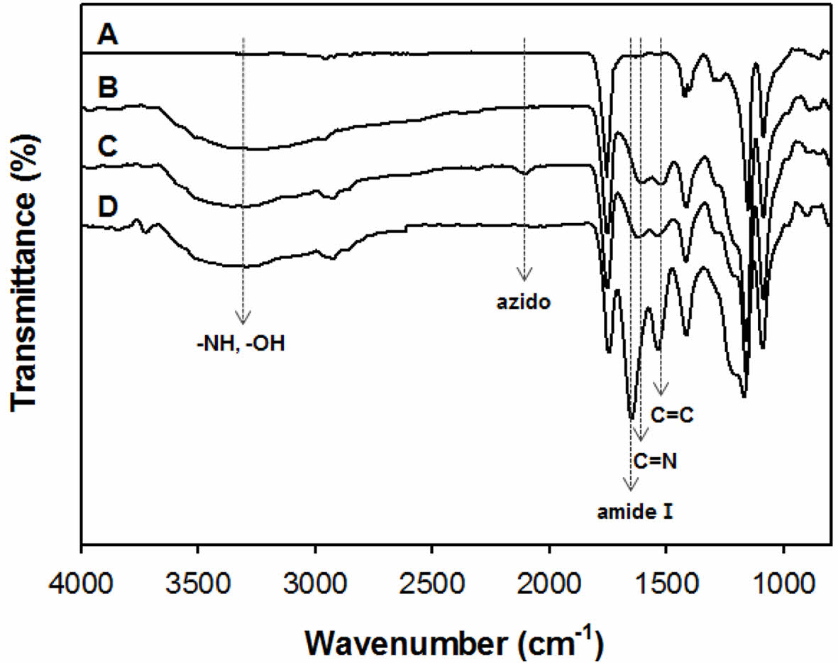 Figure 3 ATR-FTIR spectra of PGA (A), dopamine coated PGA (B), Azido-PGA (C), and BMP-2-PDA-PGA (D) scaffolds. |