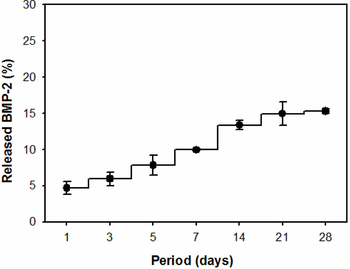 골 재생은 오랜 기간을 필요로 하는 과정이기 때문에, 골 재생 과정에 있어 burst release 없이 성장인자가 고정되어 있는 것은 특히 중요한 요소이다. 제조된 BMP-2-PDA-PGA 지지체의 방출거동은 효소면역정량법인 ELISA법을 이용하여 진행하였고, 1, 3, 5, 7, 14, 21, 28일 동안 방출거동을 관찰하였다(Figure 4). 측정 결과, 고정된 BMP-2는 7일차에 약 9.2%의 방출 거동을 보인 후, 시간이 지남에 따라 천천히 release되며 마지막 28일 차에는 15.3%의 방출거동을 보였다. 이러한 결과로부터 BMP-2가 지지체 상에 고정화되어 안정하게 유지된다는 것을 알 수 있다.