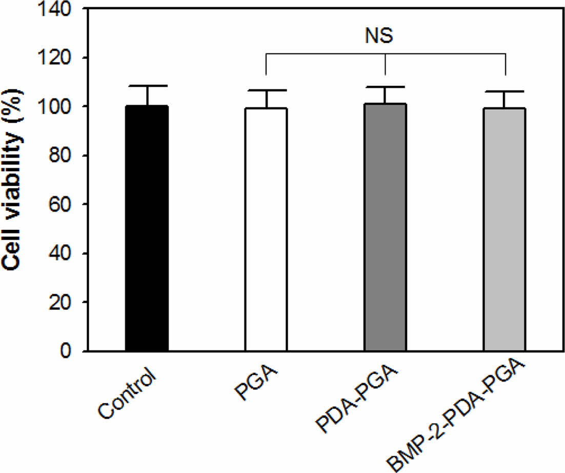 Figure 5 Cell viability of PGA, PDA-PGA, and BMP-2-PDA-PGA scaffold groups (n = 3, NS means not significant). |