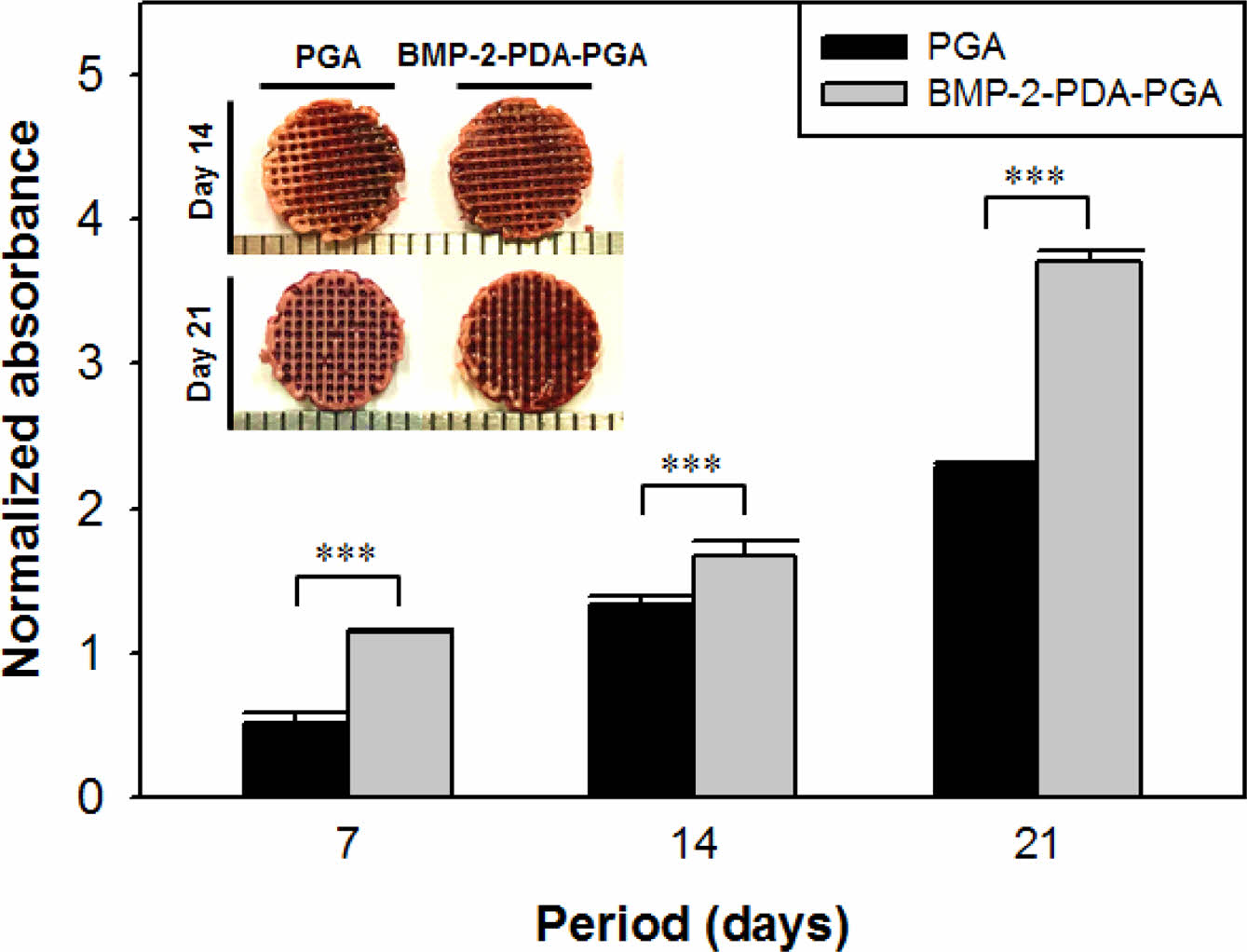 Jeong 등은 성장인자 표면에 존재하는 아미노기, 카복실기, 티올기 등의 반응기를 지지체에 직접 공유결합 시키는 화학적 가교제에 의한 고정화 방법을 진행하였다.32 그러나 이런 화학적 고정화 방법은 생체 내에서 분해되는 과정에서 알데히드, 우레아 등의 세포 독성을 나타낼 수 있는 물질이 생성된다는 주장이 제기되어 왔다. 이러한 기존의 고정화 방법의 단점 극복을 위해 현재 광 고정법을 이용하여 성장인자를 고정시키는 방법에 관한 여러 가지 연구가 보고 되고 있다. Chen 등의 연구에 따르면, 광 고정된 상피세포성장인자에 의해 혈청이 없는 조건 하에서 세포 증식을 성공하였다. 공유결합으로 지지체에 고정된 상피세포성장인자는 세포증식을 유도하여 증식이 촉진되는 결과를 나타내었다.47 또한 Woo 등은 세포성장인자를 광고정하는 방법으로 결합형 분비를 유발시켜 지속적인 자극을 나타내게 함으로써 세포 증식을 촉진시키는 연구를 발표하였다.48 하지만 위 반응들은 반응기를 성장인자에 직접 결합하여 광 고정을 진행하기 때문에 낮은 수율문제와 성장인자의 변성 문제를 초래할 수 있다. 따라서 본 연구에서는 광 반응기를 지지체 표면에 도입한 뒤 광반응을 통해 성장인자를 도입하여 보다 안정적인 반응이 가능한 BMP-2-PDA-PGA 지지체를 제작하였다.
