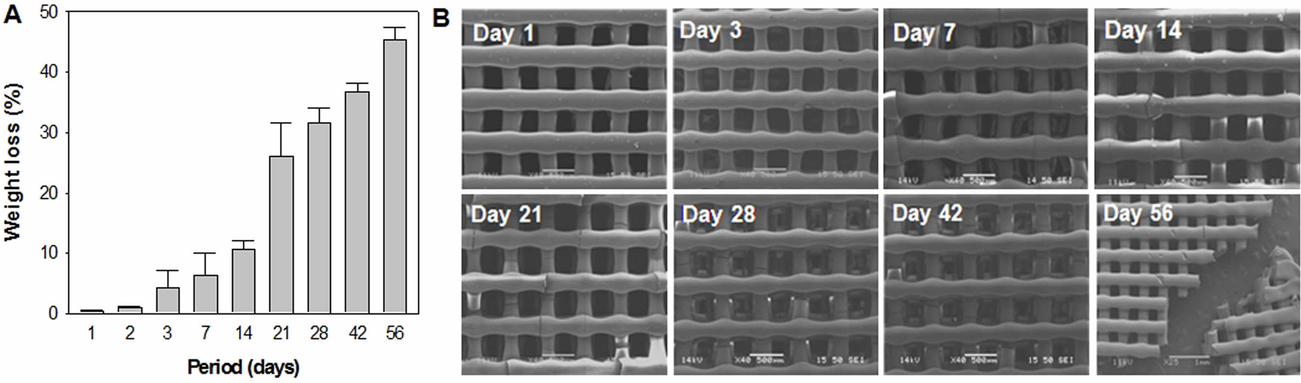 Figure 7 (A) Weight loss profile (n=3); (B) photomicrographs of BMP-2-PDA-PGA scaffolds depend on hydrolytic degradation time (37 ℃, PBS). |