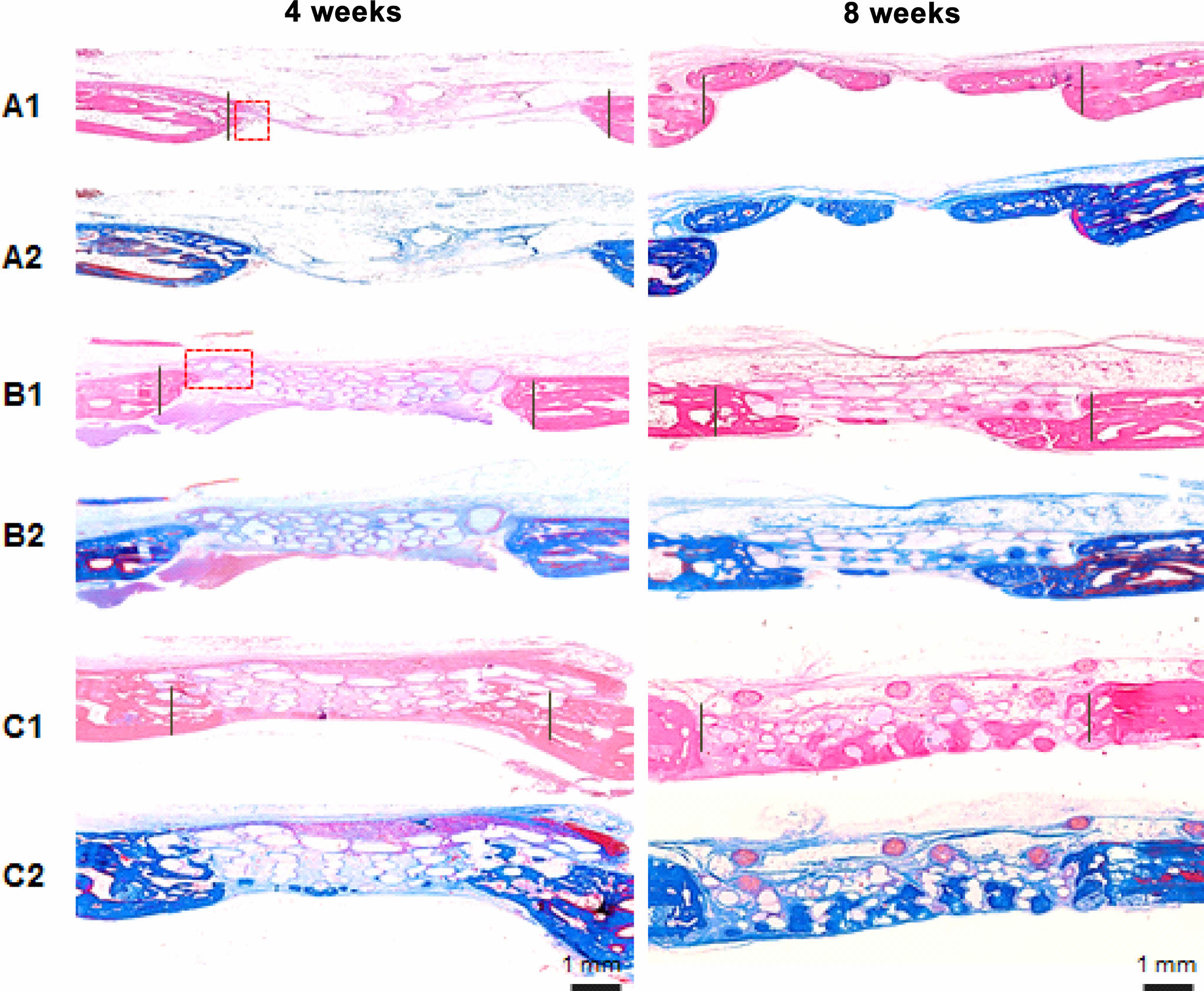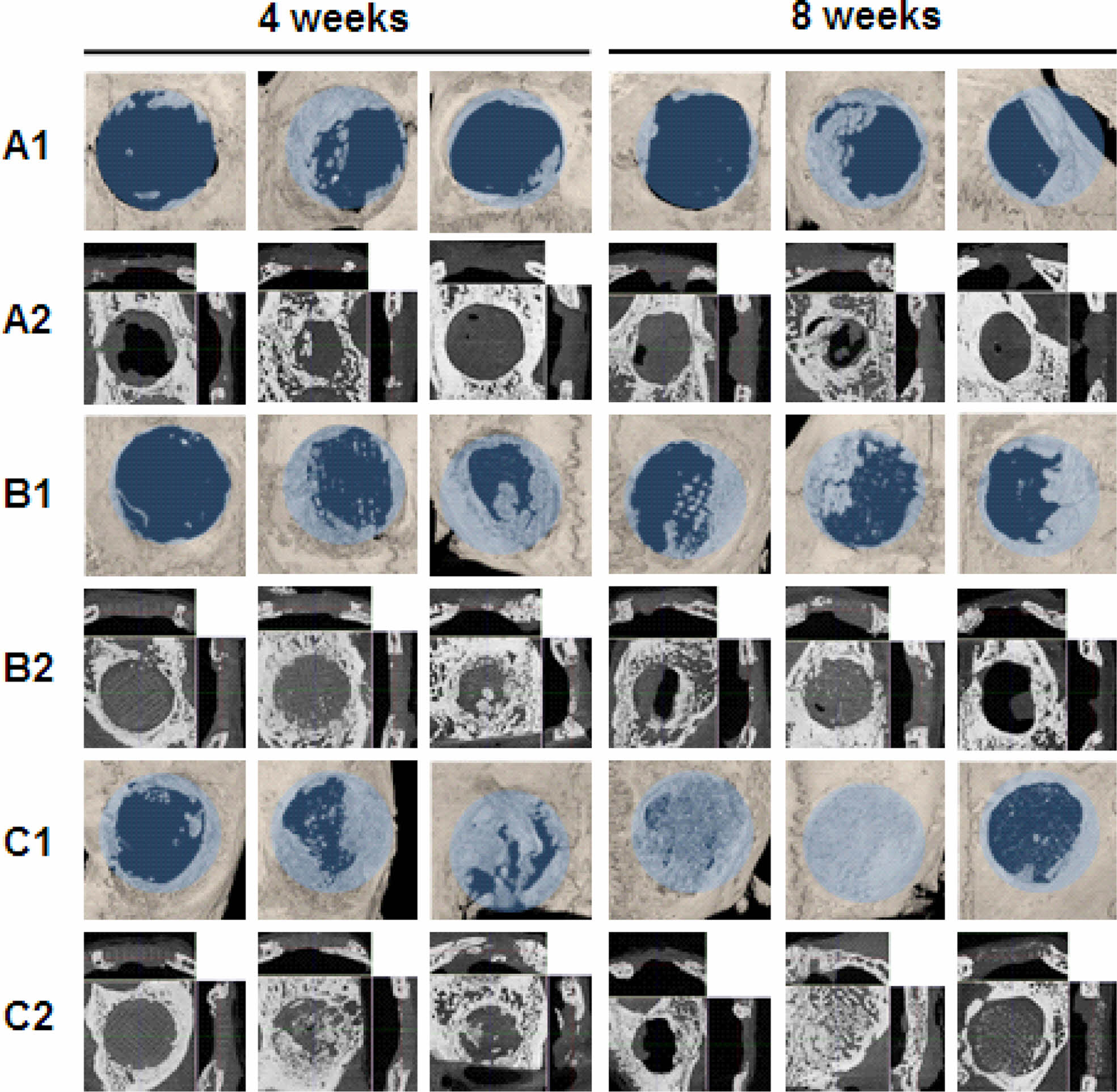Figure 8 Micro-CT images of the top surfaces (A1–C1); the perpendicular and horizontal sections (A2–C2) of the control (A); PGA (B); BMP-2-PDA-PGA; (C) scaffold groups after 4 and 8 weeks after rabbit calvarial defect model surgery (defect diameter = 8 mm, n = 3). |