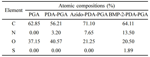 지지체 표면의 원소 조성 분석. 재료 표면에 X-선을 입사하여 광전효과를 통해 방출되는 광전자의 운동에너지를 측정함으로써, 재료의 원소조성 및 화학적 결합상태를 분석할 수 있다. 일정한 에너지를 가지는 X-선을 재료 표면에 조사하면 재료로부터 광전자(photoelectron)들이 방출되는데 이 광전자들의 운동에너지를 측정하면 광전자를 재료로부터 방출하기 위해 필요한 에너지인 binding energy를 알 수 있다. 본 연구에서는 PGA, PDA-PGA, Azido-PDA-PGA 그리고 BMP-2-PDA-PGA 지지체의 표면을 X-ray photoelectron spectroscope (Quantera, ULVAC-PHI, Japan)를 이용하여 survey scan을 하여 각 지지체 표면의 화학적 원소조성을 정량화 하였다.