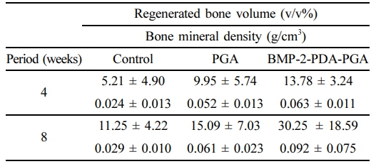 수술 후 4주와 8주에 hematoxylin-eosin과 Masson's trichrome염색을 통하여 연조직, 재생된 신생골, 검체의 원래 골조직의 결합조직 형태를 관찰할 수 있었다(Figure 9). 대조군은 4주 및 8주에 PGA 및 BMP-2-PDA-PGA 그룹과 비교하여 토끼 두개골의 천공 영역에서 연조직 침범으로 얇고 변형된 형태를 나타낸다. 대조적으로, BMP-2-PDA-PGA 그룹의 신생골은 지지체 가닥을 단단히 둘러싸고 있으며, 이는 세 그룹 중에서 골조직과 결합 조직의 가장 두꺼운 재생을 나타낸다. 그러나 4주차에서 대조군의 경우 결손 경계와 PGA 그룹의 경우 지지체 가닥 주변에서 약간의 염증 세포(호중구, 림프구, 거대 세포 대식세포)가 관찰되었다. 이러한 염증 세포는 수술 후 8주가 지나면 증식된 조골세포에 의해 캡슐화된다. 생체 내 이식 후 생분해 제품에 대한 면역 반응 및 부작용을 평가하는 것은 중요하다. 이러한 부분적인 염증에도 불구하고 새로운 골 조직은 조밀하게 형성되며 PGA strand의 분해를 기반으로 PGA 및 BMP-2-PDA-PGA 그룹의 전체 골조직 두께는 8주에 걸쳐 증가하였다. PGA는 면역학적으로 상대적으로 불활성인 것으로 보이며 우수한 임상결과를 갖고 있다.16-18 Kim 및 Lee의 연구에서도 BMP-2에 의한 조직재생능의 향상에 관한 검증이 확인되었으나, 본 연구에서와 같이 3D 프린팅 격자형 생체적합성 고분자 지지체에 표면처리 및 BMP-2 광고정법을 적용한 연구는 없었다.50,51 재생된 골량과 bone mineral density에 대한 정량적 산출값은 Table 2에 정리하였다. BMP-2-PDA-PGA 그룹의 재생골량과 bone mineral density는 대조군과 PGA 그룹에 비해 4주차 및 8주차에서도 일관되게 우수한 값을 나타내었다. 이는 3D 격자형 지지체의 구조가 신생골조직 공간을 효과적으로 제공하고, PGA 표면에 고정된 BMP-2가 지속적으로 골형성 자극을 유도한 복합적인 결과에 의한 것으로 사료된다.