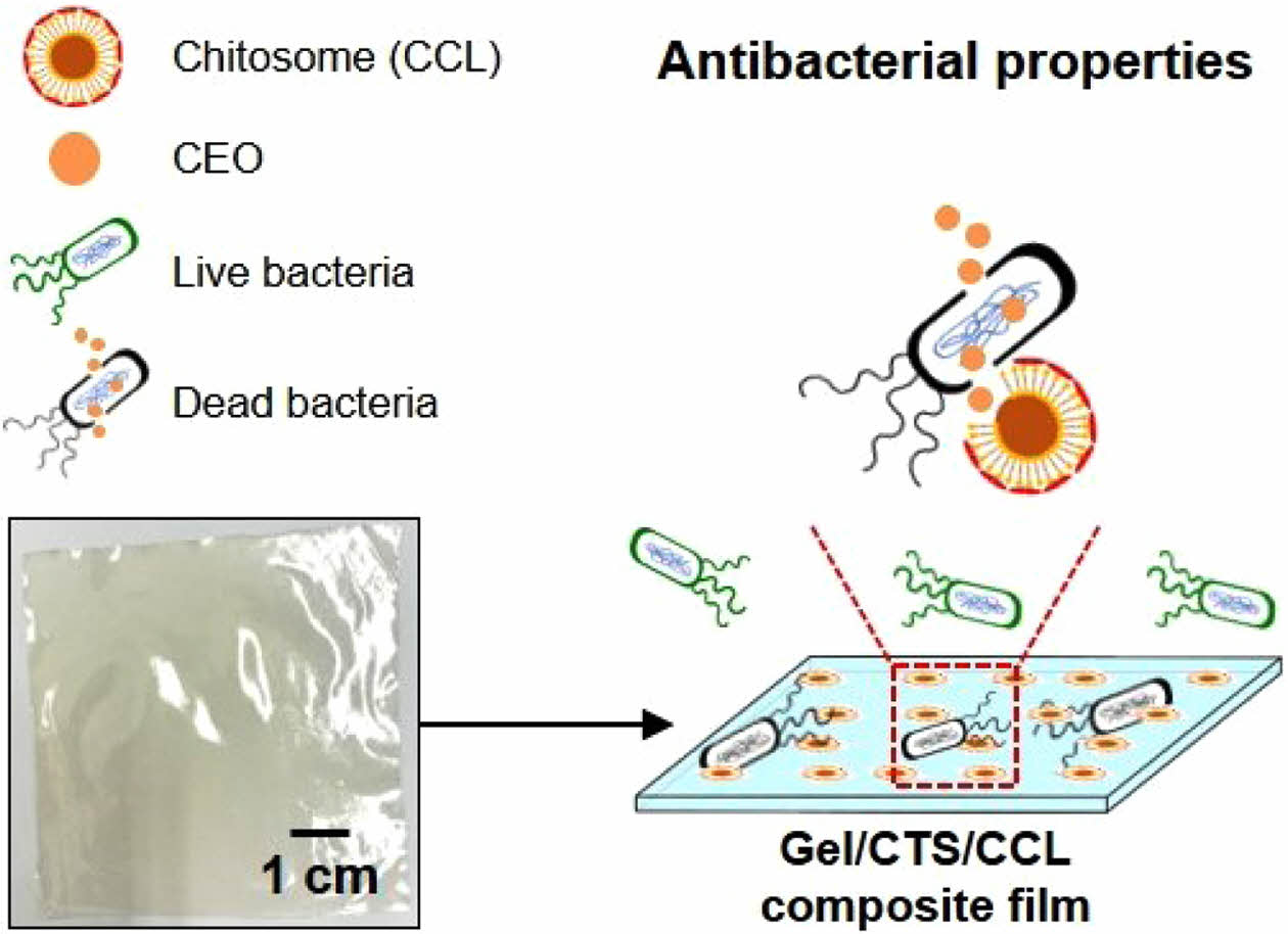 Figure 1 Schematic representation and photograph of Gel/CTS/CCL film and its antibacterial properties. |