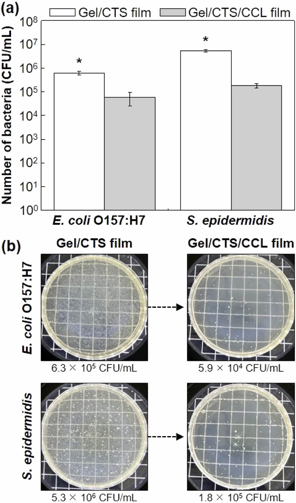 Figure 3 (a) Graph shows the antibacterial efficacy of both Gel/ CTS film and Gel/CTS/CCL film surfaces against E. coli O157:H7 and S. epidermidis (asterisk indicate statistically significant differences at p < 0.05); (b) photographs of the bacterial colonies that developed on agar plates treated with Gel/CTS film and Gel/CTS/ CCL film. |