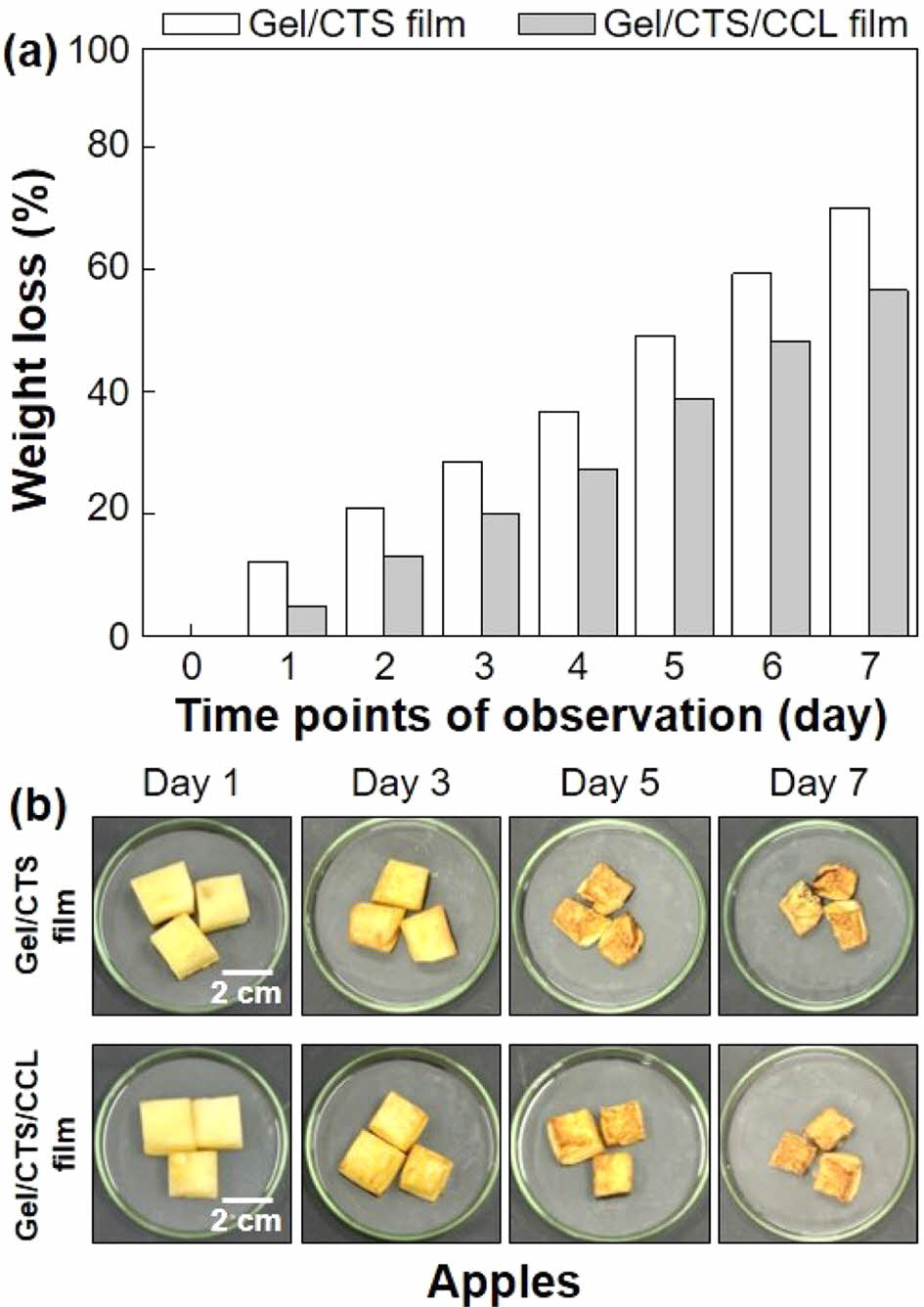 Figure 5 (a) Weight loss (%) in apples packed with Gel/CTS films and Gel/CTS/CCL films over a period of 7 days is presented; (b) impact on the visual appearance changes of apples is examined. |