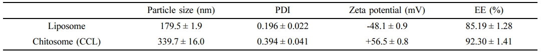 입자 크기, 제타포텐셜 및 포집효율. Table 1에서 리포솜과 키토솜의 DLS 측정 결과를 보여준다. 제조된 리포솜의 평균 입자 크기는 179.5 ± 1.9 nm의 크기를 가지며, 키토솜은 339.7 ± 16.0 nm의 입자 크기를 갖는 것으로 확인되었다. 이는 키토산의 아민 그룹과 리포솜의 인지질 그룹 간의 정전기적 상호작용을 통한 리포솜 막 표면에 자가조립으로 리포솜에 얇은 코팅층이 형성되었다. 추가적으로 리포솜과 키토솜의 제타포텐셜 값을 보여주며 리포솜의 제타포텐셜은 -48.1 ± 0.9 mV이고, 키토솜의 제타포텐셜은 +56.5 ± 0.8 mV이다. 이는 리포솜의 표면 전하가 포스파티딜세린 성분으로 음전하를 띄며, 키토솜 구조 내의 아민 그룹이 양전하를 띄기 때문이다.28