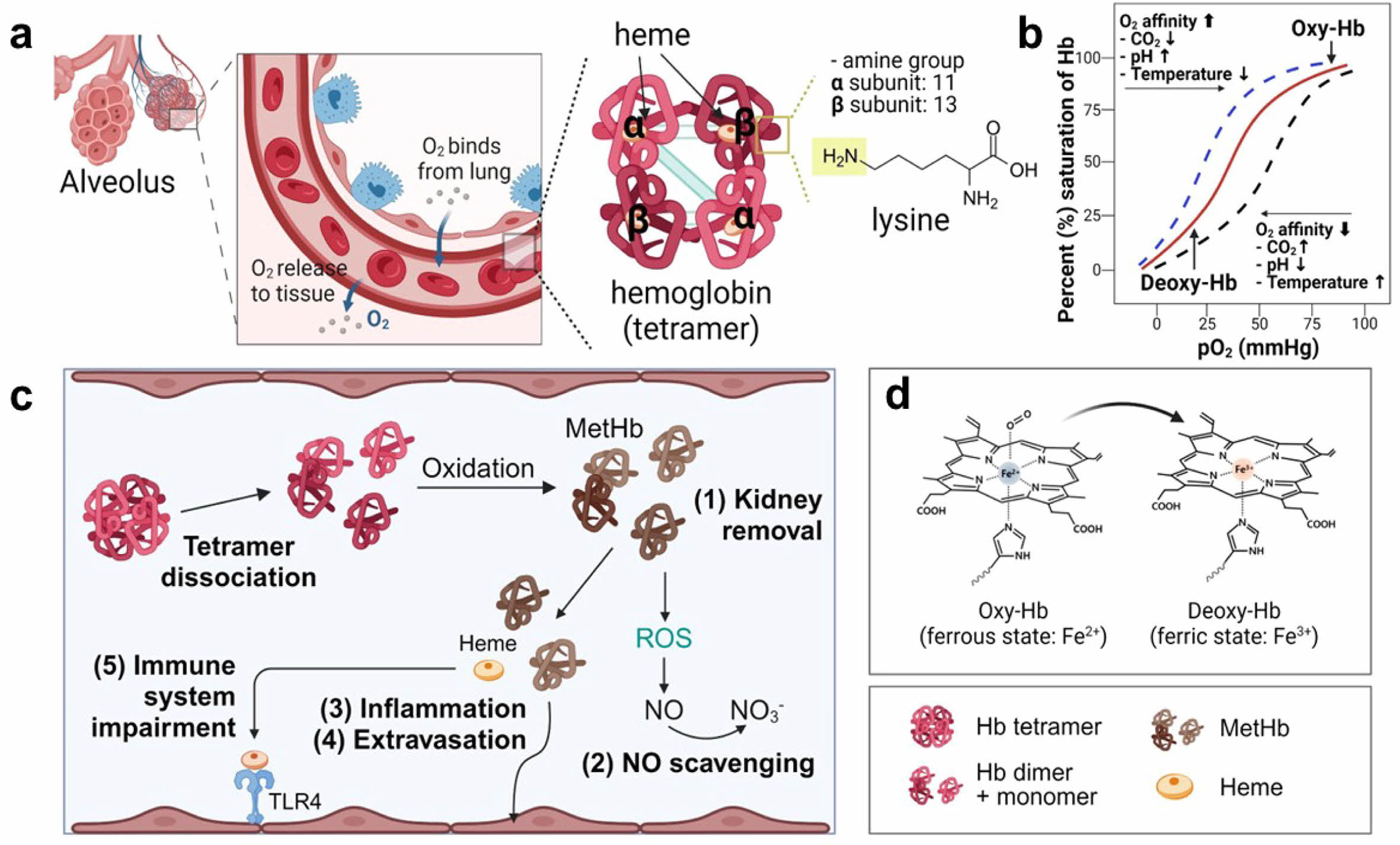 The structure of hemoglobin and the limitations of cell-free hemoglobin: (a) structure of hemoglobin and oxygen binding and dissociation; (b) oxygen dissociation curve of hemoglobin; (c) limitations of cell-free hemoglobin; (d) iron ion oxidation of heme. Created with BioRender.com