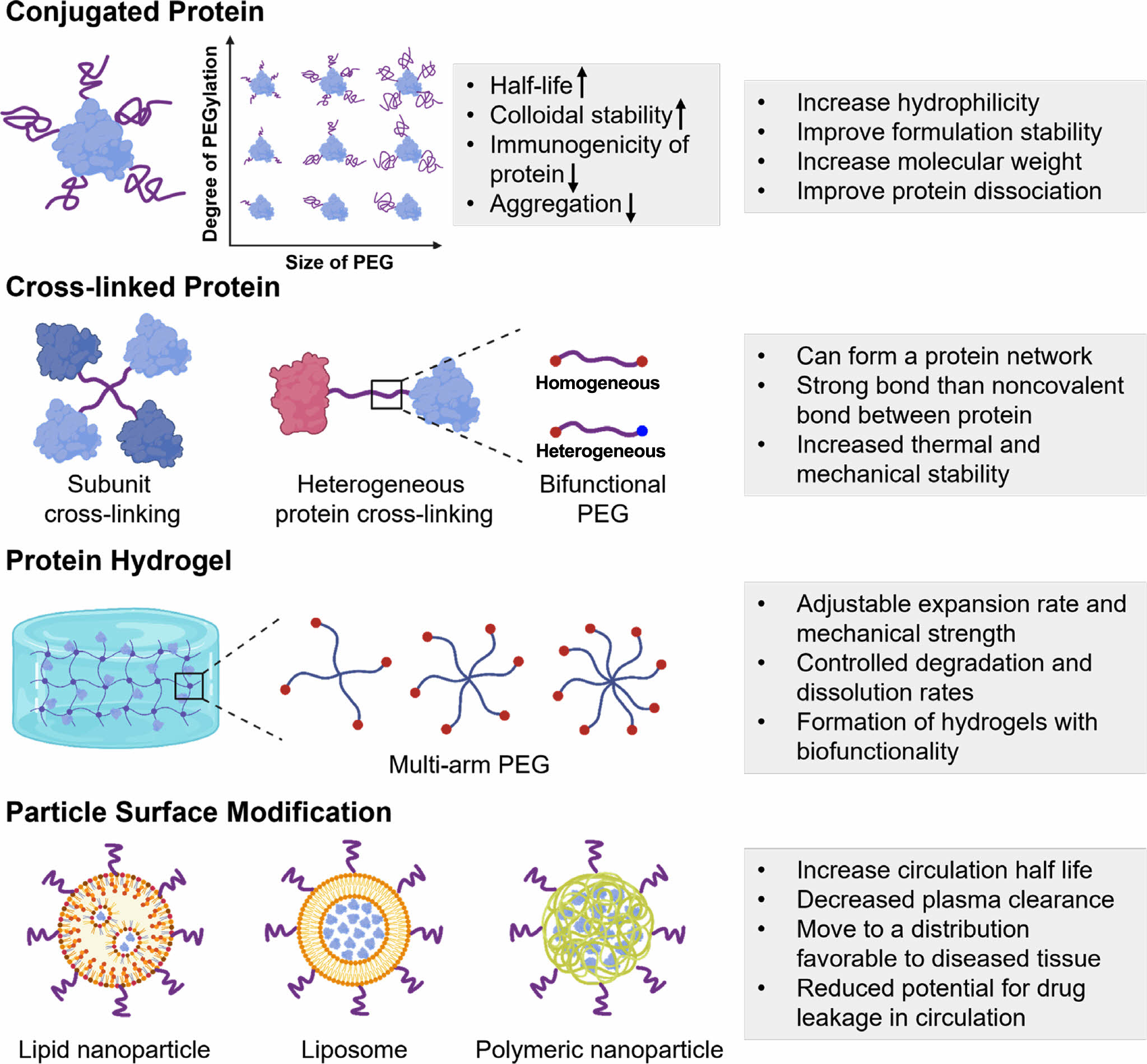 Various forms of Hemoglobin-based Oxygen Carriers Using PEG. Many researchers have actively investigated various strategies for the PEGylation of proteins. Conjugation typically involves attaching PEG molecules to specific amino acid residues on the protein surface, enhancing its pharmacokinetic profile and reducing its immunogenicity. Crosslinking PEG to proteins results in the formation of PEG-protein complexes or conjugates that can alter protein interactions and creating versatile biomaterials. Hydrogel formation using PEGylation allows proteins to be encapsulated within a three-dimensional network, facilitating controlled release and applications in tissue engineering. Modifying the surface of particles, such as liposomes, with PEG improves biocompatibility, reduces aggregation, and enhances targeting precision in drug delivery systems.18