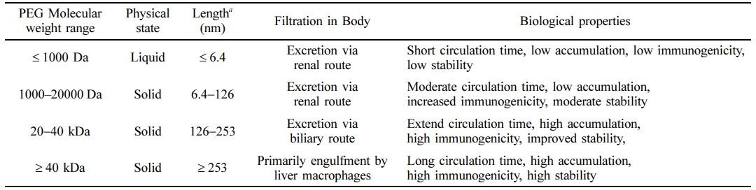 PEG molecules can vary in size depending on the number of repeated units (Table 1). PEG is excreted from the body intact, with smaller PEGs (less than 30 kDa) eliminated via the kidneys and larger PEGs (> 20 kDa) through fecal excretion.