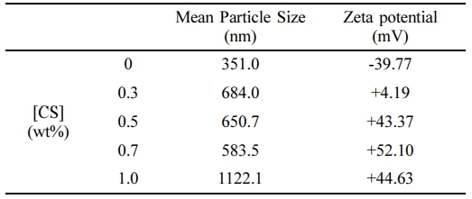 CS의 농도에 따른[(St-AA)NP]@CS의 외관을 Figure 2에서 보였다. CS 농도가 0.7 wt% 이하인 경우에는 비교적 균일한 표면을 갖는 [(St-AA)NP]@CS가 형성되었으나, CS 농도가 1.0 wt%인 경우, 과량의 CS로 인해 입자간 회합이 일어나는 것을 확인할 수 있다. 이는 Table 1에서 보인[(St-AA)NP]@CS의 CS 농도에 따른 입도와 제타전위 변화에서도 확인할 수 있다. 박막적층 이전의 (St-AA)NP는 351.0 nm의 평균 입경을 나타내었으며, CS의 적층에 따라 입경이 증가하는 것을 확인할 수 있다. CS의 농도가 0.3-0.7 wt%의 범위인 경우 580-685 nm의 크기를 나타내는 데 반해, 1.0 wt%에서는 1120 nm 이상의 급격한 입경 증가를 나타내어 입자간 회합에 의한 평균 입경의 증가가 이루어짐을 알 수 있다. AA에 의해 -39.77 mV의 제타전위를 갖는 (St-AA)NP는 양전하를 갖는 CS의 적층에 의해 제타전위가 양의 값으로 전환됨을 확인할 수 있었는데, CS 농도 0.3 wt%인 경우는 매우 미약한 제타전위를 나타내는 반면, 0.5-1.0 wt%에서는 +40 mV 이상의 제타전위를 나타내어 Pochapski 등이32 규정한 높은 수준의 분산안정성을 확보하였음을 확인하였다. 제타전위는 CS 농도 0.7 wt%에서 가장 높은 값인 +52.10 mV를 나타내었으며, 1.0 wt%에서는 도리어 감소하는 경향을 나타내었다. 이는 높은 CS 농도로 인해 입자간 회합이 발생하기 때문으로 추정되며, [(St-AA)NP]@CS의 최적 제조는 CS 농도 0.7 wt%에서 가능한 것으로 판단되었다.