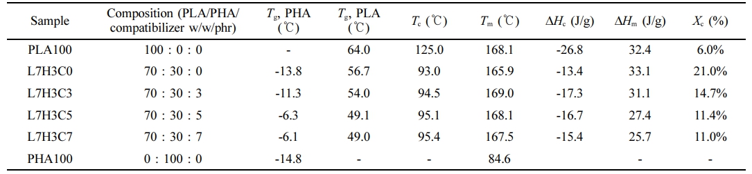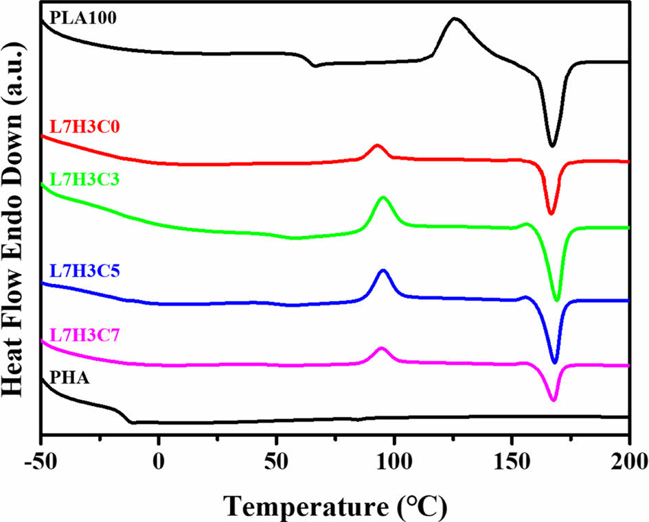 2nd heating scan DSC curves of PLA, PHA, and compatibilized PLA/PHA (70/30) blends.