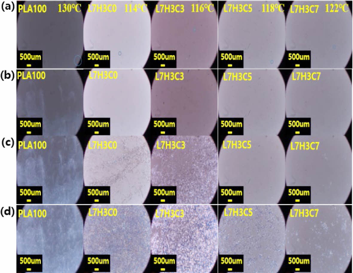 또한, PLA/PHA 블렌드의 결정성장 거동을 확인하기 위해 PLA100와 상용화제의 함량을 다르게 하여 제작된 L7H3C0, L7H3C3, L7H3C5, L7H3C7의 결정성장을 온도에 따라 POM으로 측정하여, 그 결과를 Figure 2에 나타내었다.