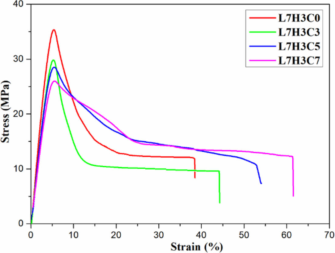 Stress-strain curves of compatibilized PLA/PHA (70/30) blends.