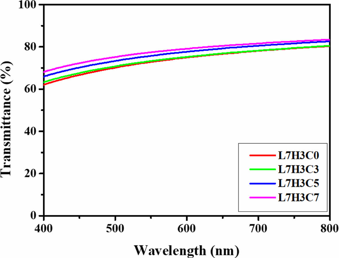 기계적물성 및 투과도 분석. Figure 3은 상용화제를 함량별로 첨가하여 제조한 PLA/PHA(70/30) 블렌드의 대표적인 stress-strain 거동을 보여준다. Figure 4는 Figure 3으로부터 얻어진 인장강도, 연신율과 함께 Izod 충격강도를 측정하여 정리하여 나타냈다. 전체적으로 PLA/PHA(70/30) 블렌드에 PHA-g-MA 상용화제 함량이 증가함에 따라 인장강도가 감소하는 경향을 보였으며, 연신율은 증가하는 경향을 보였다. 또한, 상용화제가 도입되고 함량이 증가된 PLA/PHA 블렌드의 충격강도는 상용화제가 도입되지 않은 PLA/PHA 블렌드의 충격강도보다 증가하였다. 이러한 결과는 열적분석을 통해 확인되듯이, PLA/PHA 블렌드는 상용화제 함량이 증가함에 따라 상용성이 증가되었지만, PLA/PHA 블렌드의 결정성장 거동을 방해하여 결정화도를 감소시켰기 때문으로 판단할 수 있었다.30,31 또한, 상용화제 함량에 따른 PLA/PHA(70/30) 블렌드의 투과도 결과를 Figure 5에 나타냈다. Figure 5에서 보듯이, L7H3C0, L7H3C3, L7H3C5, L7H3C7은 550 nm 기준으로 각각 72.8, 73.2, 75.9, 77.4%의 투과도를 보여준다. 상용화제 함량이 증가할수록 투과도가 증가하였는데, 이러한 경향은 Table 1의 결정화도를 통해 확인할 수 있듯이, 결정화도의 감소가 투과도에 영향을 받은 것으로 판단할 수 있었다.