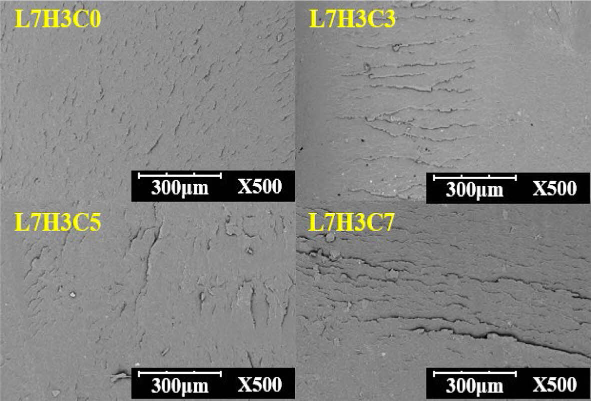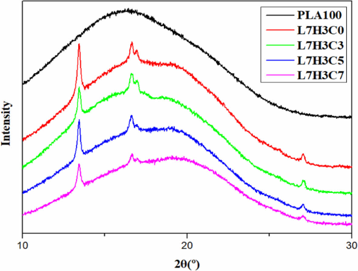 상용화제가 첨가된 PLA/PHA 블렌드의 결정화도를 계산하기 위해 엔탈피(ΔHm)를 통해 결정화도(Xc)를 계산하여 Table 1에 나타냈다. 순수한 PLA(PLA100)의 결정화도는 6.0%에서 PHA가 30 wt%로 블렌드된 L7H3C0의 결정화도는 21.0%로 급격히 증가하였다. 이는 무정형인 PHA가 PLA/PHA 블렌드에서 기핵제의 역할을 하여 결정성장을 촉진하였기 때문이다. 하지만, 상용화제를 첨가하면 결정화도가 감소하는 경향이 있었다. 이를 통해 상용화제는 기핵제인 PHA의 결정성장 거동을 방해하여 결정화도가 감소되도록 기인한다는 것을 알 수 있었다.26,27