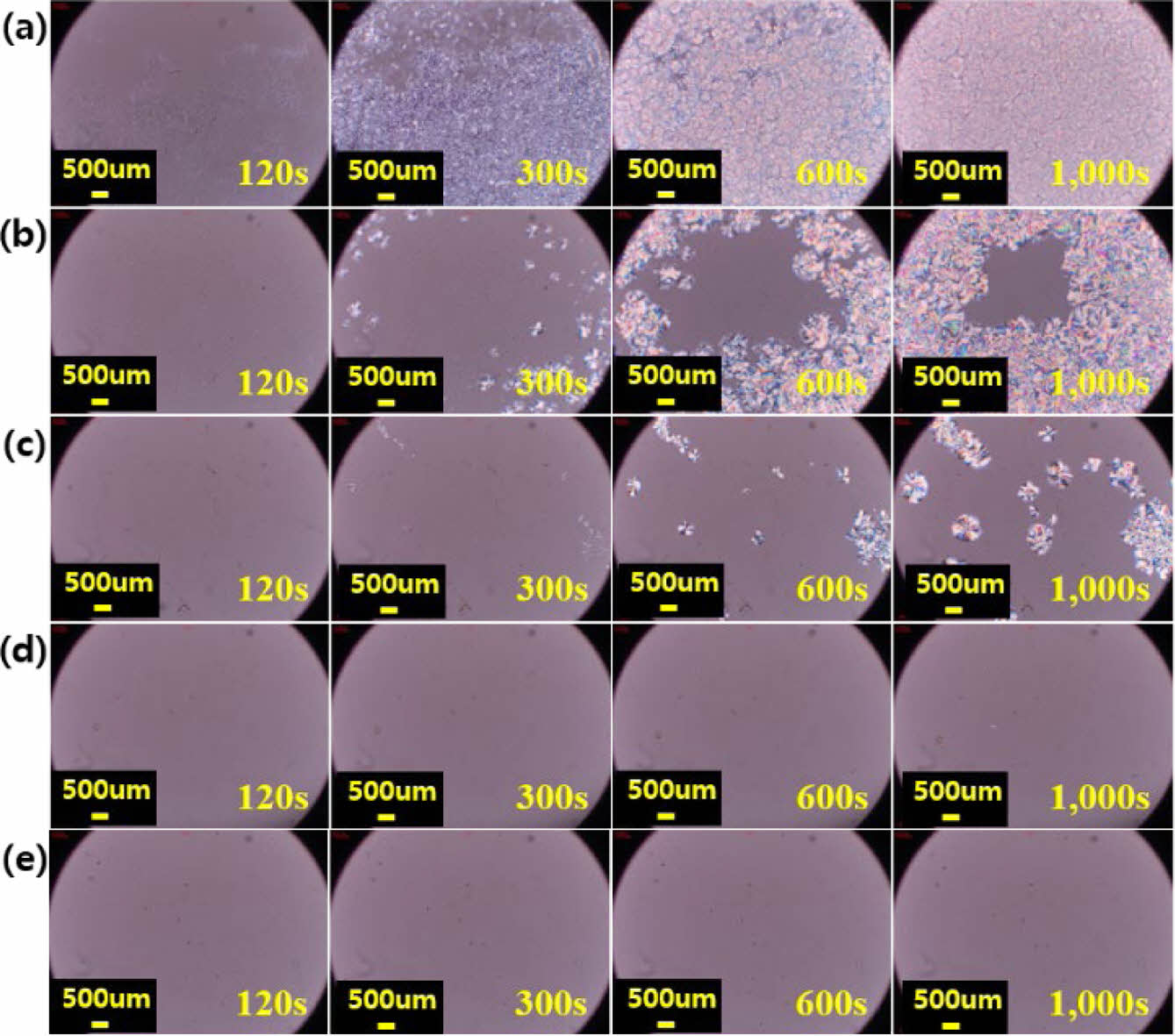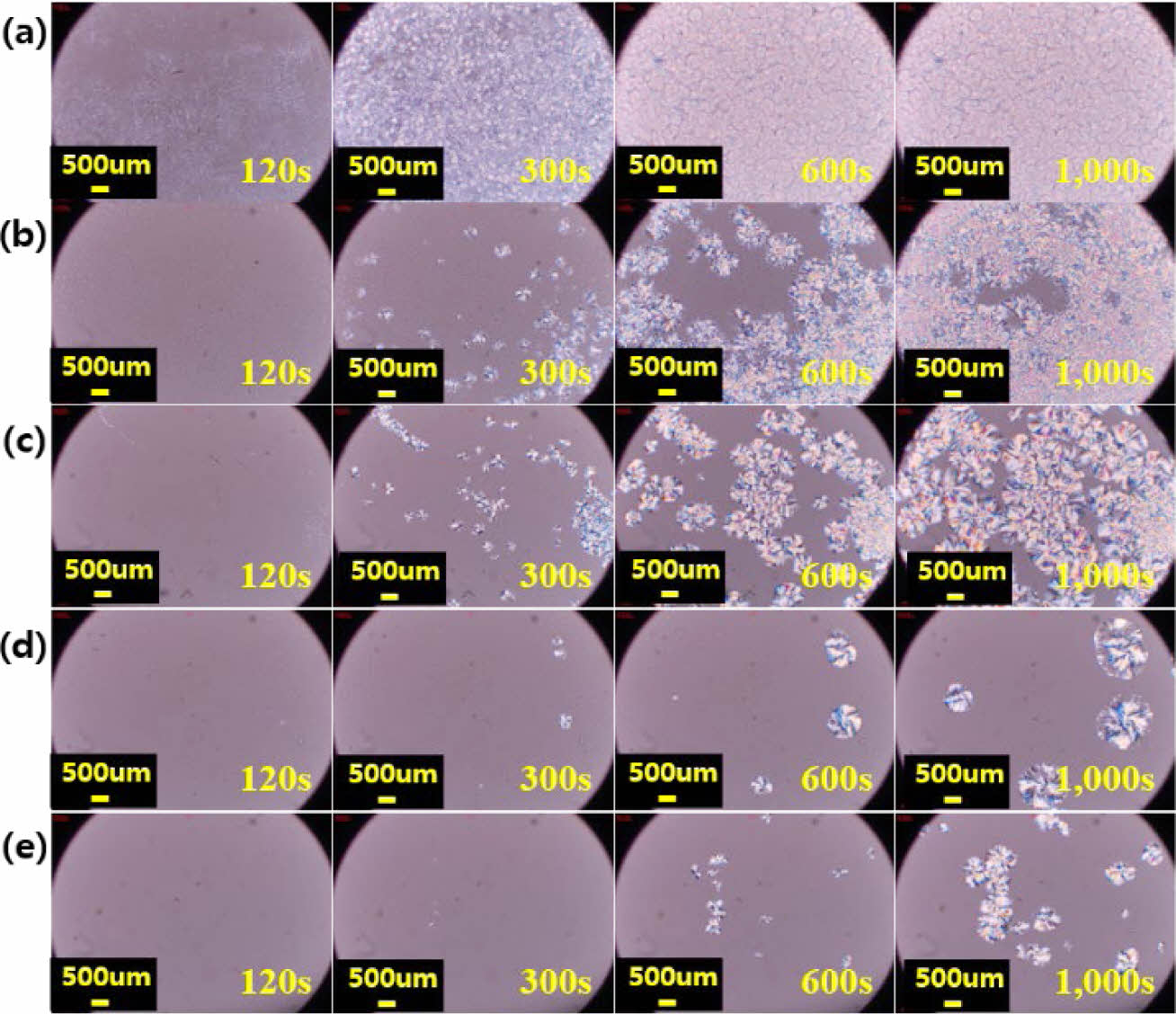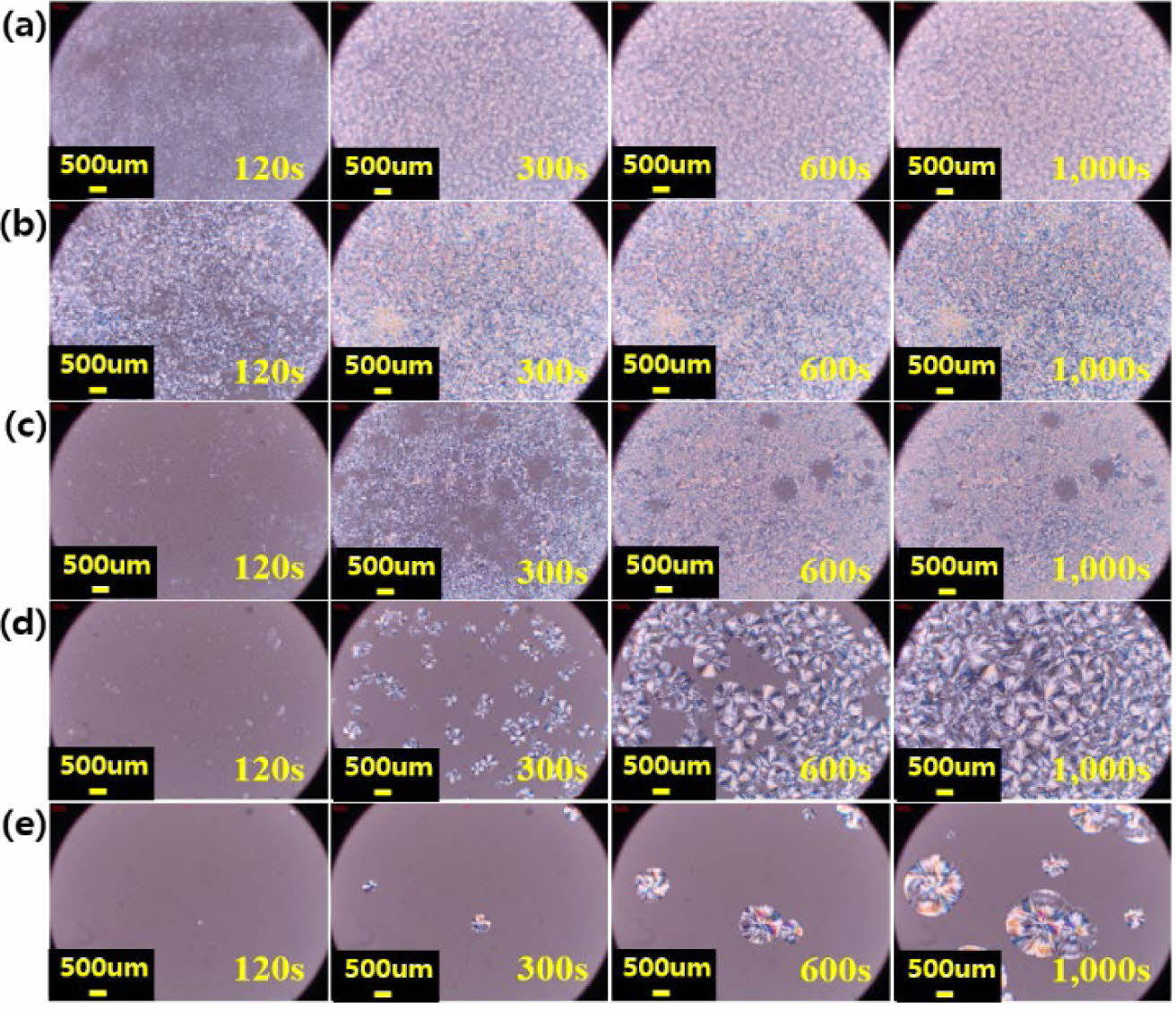 등온 결정화 동역학 분석. 결정성장 거동을 확인하기 위해 편광 광학 현미경(polarized optical microscopy, POM, Nikon, LV100POL, Japan)을 사용하여 분석하였다. 결정화 거동의 kinetic상수를 확인하기 위해 DSC분석을 수행하여 결정화가 진행되는 시간을 측정하였으며, Avrami 식 (4)을 사용하여