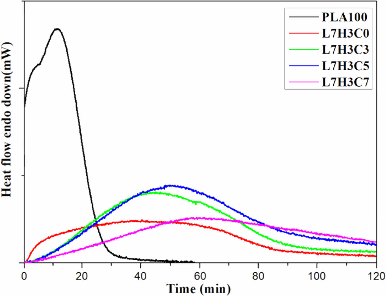 Isothermal crystallization curves of 135 ℃ for compatibilized PLA/PHA blends.