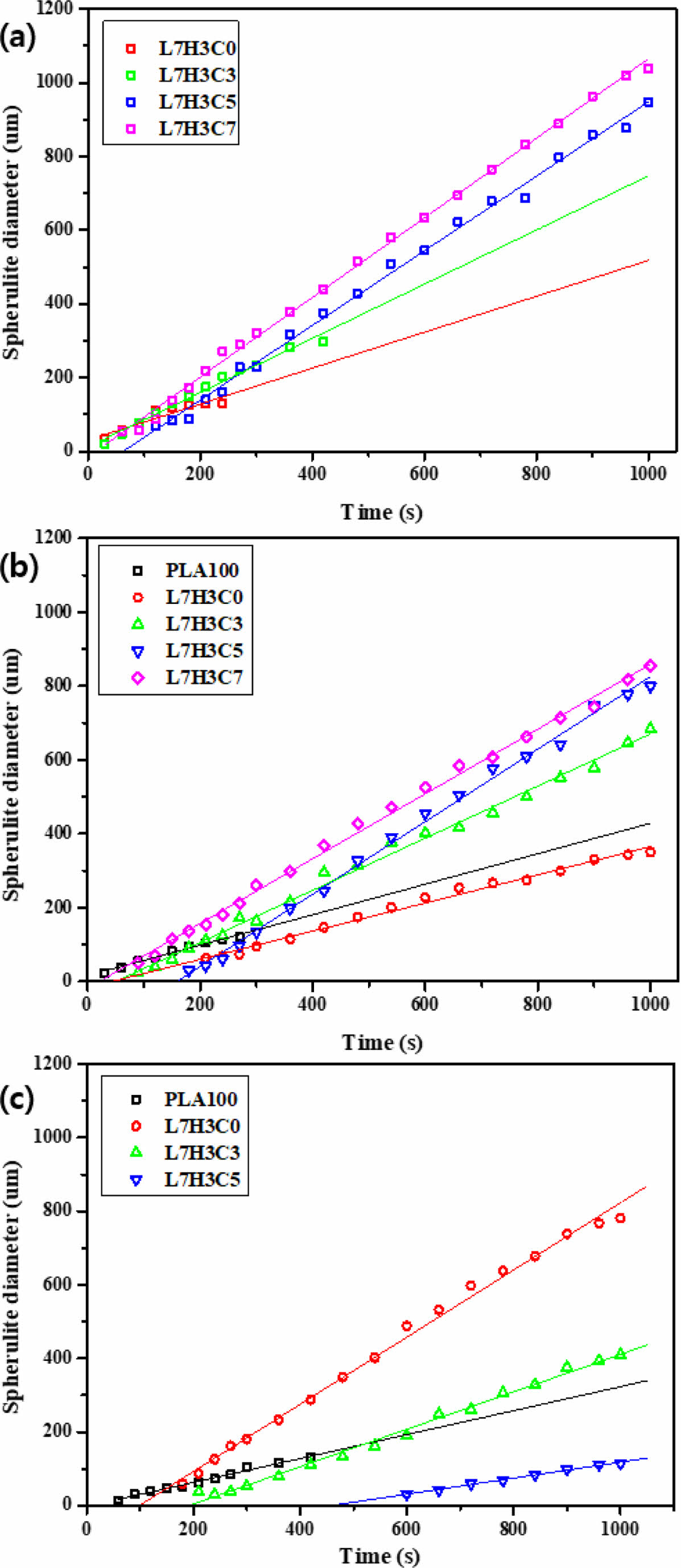 Figure 8부터 Figure 10까지의 POM 분석으로부터 30초의 일정한 시간 간격으로 구형 결정의 직경을 측정하여 등온 결정시간과 결정의 직경 사이의 관계를 Figure 12에 나타냈다. 시간에 따라 직경이 선형으로 증가하는 것을 관찰했으며, 이러한 기울기는 결정성장률을 나타낸다. 기울기는 온도에 따라 차이가 발생하는 것도 확인할 수 있었다. Figure 12(a)와 12(b)에서 보는 바와 같이, L7H3C0보다 L7H3C3, L7H3C5, L7H3C7처럼 상용화제 함량을 증가시키면 결정성장율이 점진적으로 증가하였다. Figure 12(c)는 135 ℃의 등온결정화 온도에서 결정시간에 따른 결정화 크기를 나타냈다. Figure 12(c)를 통해 L7H3C0이 결정화가 가장 먼저 시작되었고, 상용화제가 도입된 블렌드에서는 상용화제 함량이 증가할수록 결정성장률이 감소하였다. 이것은 높은 등온결정화 온도에서는 상용화제 함량이 증가할수록 완전 결정화가 되는데 걸리는 시간이 늦어지고 그에 따라 결정이 성장하는 시간이 오래 걸리기 때문이다. 특히, L7H3C7의 경우 1000초까지 결정이 발견되지 않았는데, 이것은 높은 등온결정화 온도에서 높은 함량으로 도입된 상용화제 의해서 고분자 블렌드의 결정의 성장이 매우 크게 방해받아 결정의 성장이 매우 느리게 형성되기 때문으로 판단되었다.