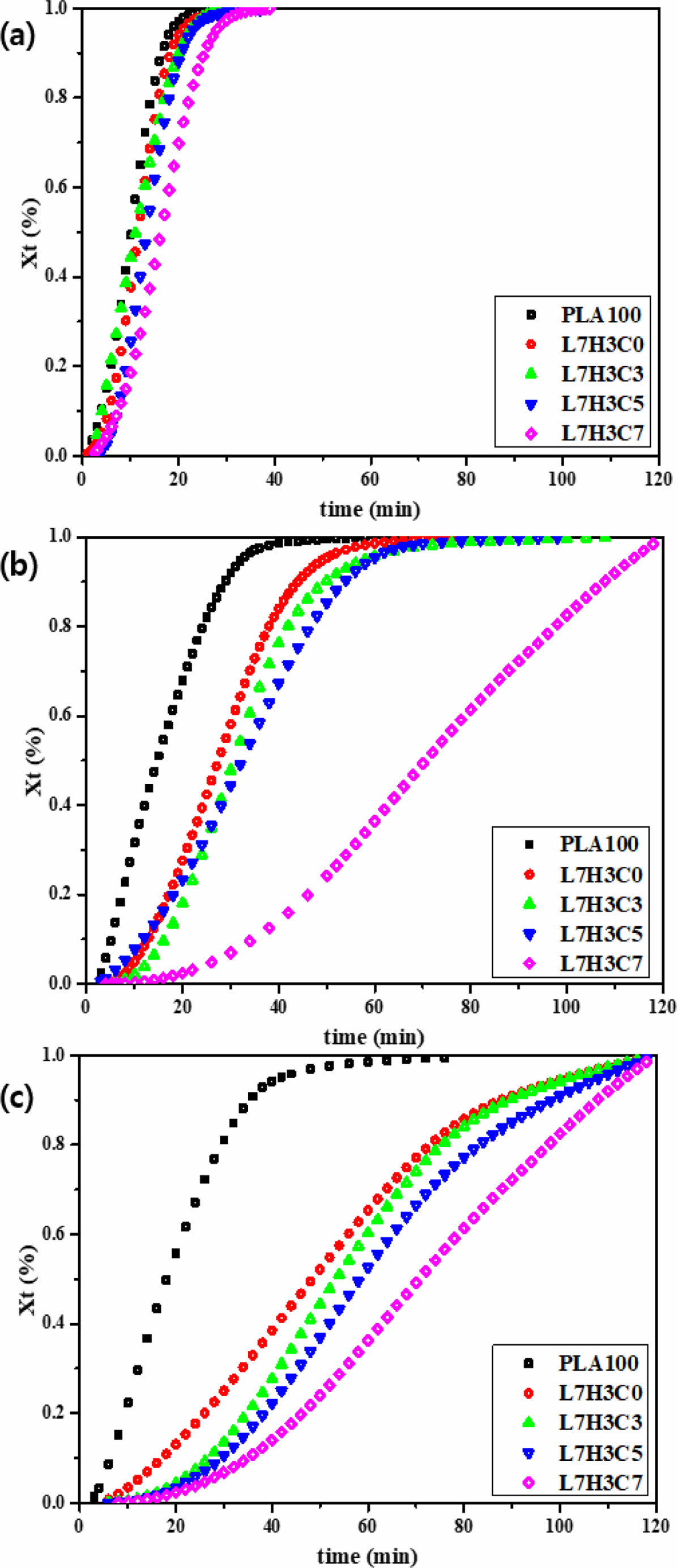 elative crystallinity X(t) versus different crystallization time (t) of PLA and compatibilized PLA/PHA blends observed at various isothermal crystallization temperature of (a) 120 ℃; (b) 130 ℃; (c) 135 ℃, respectively