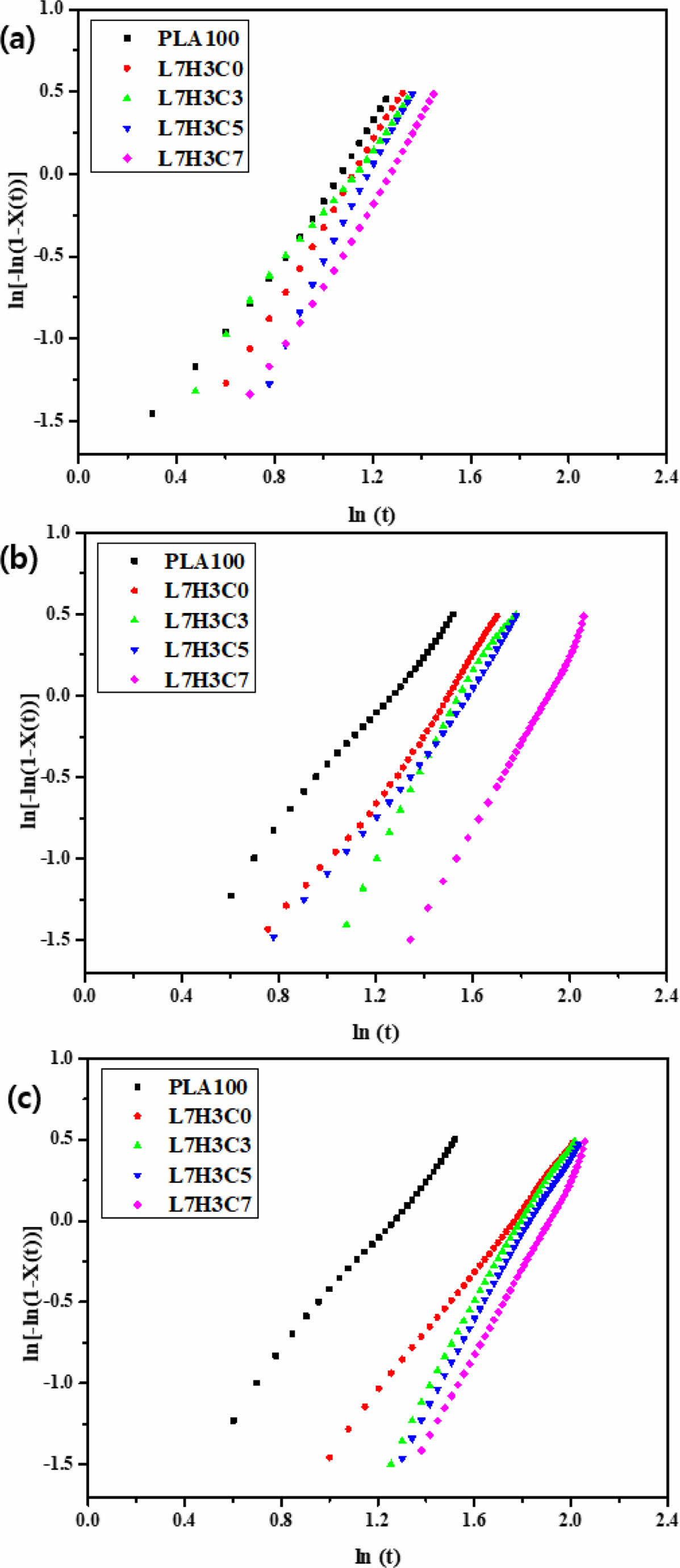 Figure 14에서 보는 바와 같이 열분석에 의하여 얻어진 ln(t)와 ln(-ln(1-Xt)를 플롯하여 나타냈다. 각각의 등온 온도에서 결정화 속도와 시간의 관계가 선형(R2: 0.9928-0.9994)으로 나타나며, 이들의 절편과 기울기를 사용하여 k와 Avrami model의 지수 n을 구하였다. 또한 k값을 이용하여 반 결정화 시간(crystallization half time, t1/2)을 계산하였고, 이를 Table 2에 정리하였다. 반 결정화 시간(t1/2)은 모든 조성에서 온도가 증가함에 따라 반 결정화 시간 역시 증가하는 경향을 보이고 있었다. 고분자의 반 결정화 속도는 결정핵의 생성 속도와 결정이 성장하는 속도에 영향을 받는데, 이 두 가지 인자 중 결정핵의 생성에 미치는 결정화 온도의 영향은 온도가 높아질수록 결정이 생성되는데 걸리는 시간이 길어지고, 결정핵의 생성을 방해하여 결정화 속도가 늦어지는 것을 의미한다.39 앞서 언급한 POM실험에서 확인된 것처럼, 상용화제의 첨가로 결정화 생성속도가 감소함을 확인할 수 있었다. 또한, Table 2에서 볼 수 있듯이 PLA100와 L7H3C0의 Avrami 지수 n 값이 1.77에서 2.04로 확인되었다. 이는 Figure 8-10을 통해서도 확인할 수 있는데, 방사형 구조로 결정이 나타나기 보다, 선형의 형태로 결정이 불규칙하게 성장하는 것을 알 수 있었다.28,29 반면에, 상용화제가 포함된 L7H3C3, L7H3C5, L7H3C7의 조성에서는 n 값이 2.51에서 2.97으로 확인되었다. 이를 통해 PLA/PHA(70/30) 블렌드에 상용화제를 첨가하면, 결정화 속도가 감소하여 방사형으로 결정이 성장하는 것을 확인하였다.