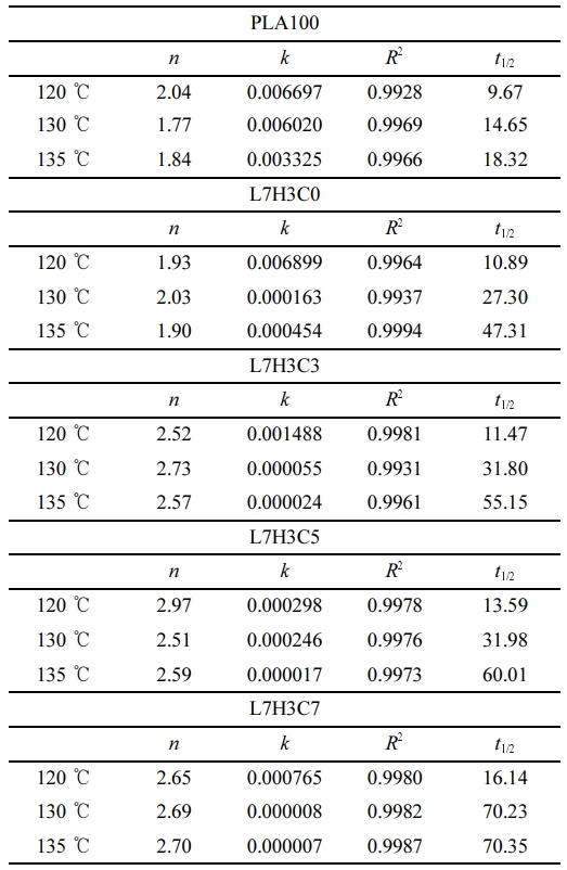 Plots of ln(-ln(1-Xt) versus ln(t) for PLA and compatibilized PLA/PHA blends with various temperature: (a) 120 ℃; (b) 130 ℃; (c) 135 ℃.