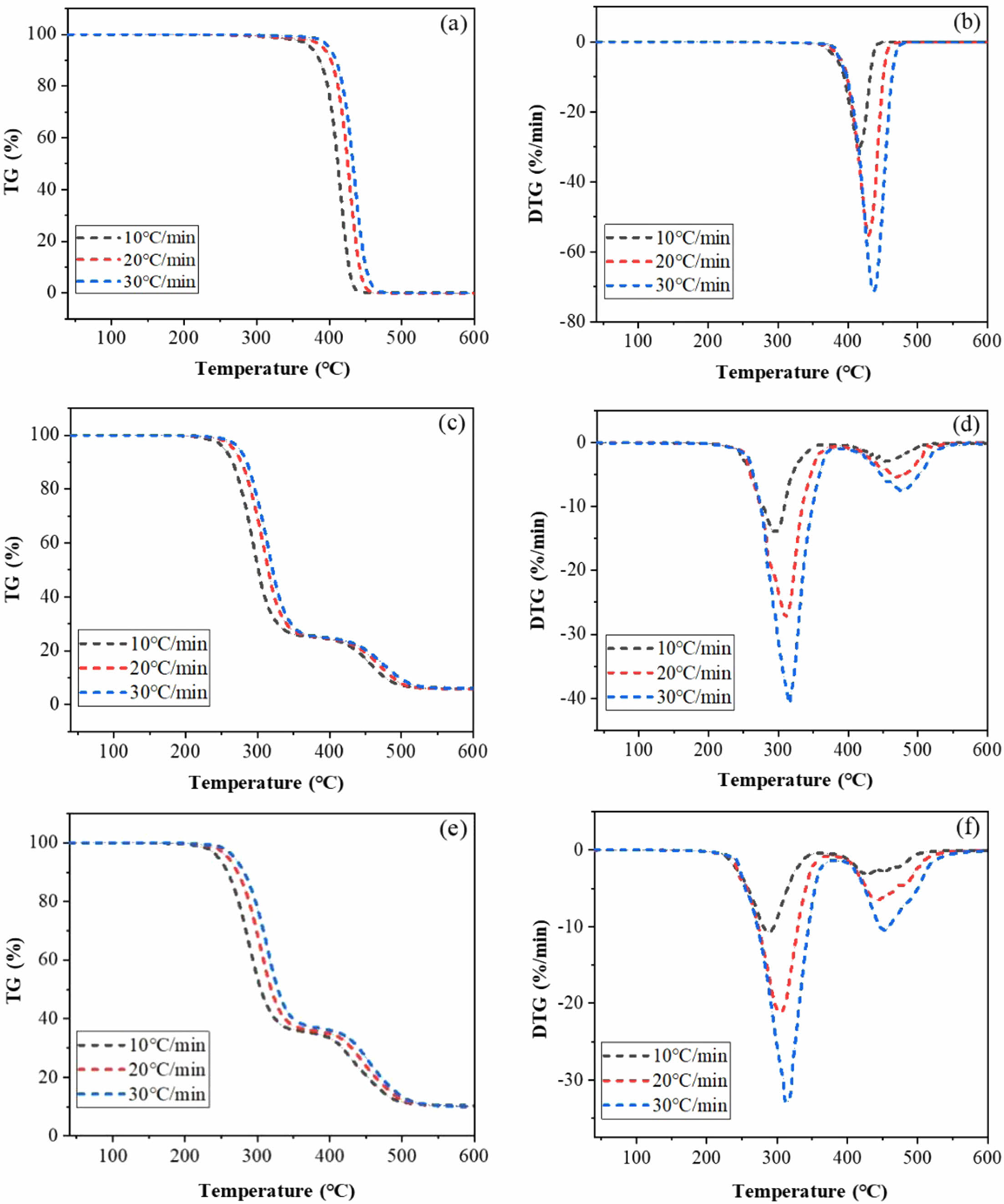 Figure 1 illustrates that the TG-DTG curves for PS, PVC, and PS/PVC exhibit consistent patterns across various heating rates, including 10, 20, and 30 ℃/min. This consistency indicates that alterations in the heating rate do not affect the overall shape of the TG-DTG curves. However, it is observed that as the heating rate increases, the TG curves shift towards higher temperatures. This shift is primarily due to pyrolysis hysteresis in the experimental materials, which is influenced by the heating rate.34 The DTG curves distinctly show that the maximum rate of pyrolysis is significantly elevated at higher heating rates compared to lower ones. This trend suggests a direct correlation between the heating rate and the maximum rate of pyrolysis. The primary reason for this is that higher heating rates result in shorter exposure times to heat for the materials, thus increasing the maximum rate of pyrolysis. Therefore, it can be concluded that the maximum rate of pyrolysis escalates with an increase in the heating rate.