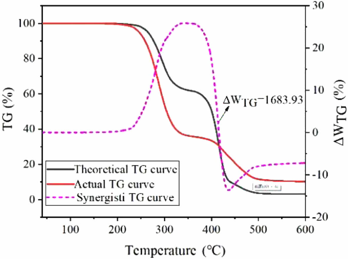 It can be seen from the polystyrene (PS)/WTs-theoretical thermogravimetric (TG) curve in the Figure that the synergistic effect in the pyrolysis process of PS/PVC is dominated by positive synergistic effect, and when the pyrolysis temperature of the experimental sample is 256.1-407.3 ℃, there is a positive synergistic interval (DWTG>0), indicating that there is a positive promotion effect on the co-pyrolysis of mixed samples in this stage. When the pyrolysis temperature is 407.7-600 ℃, there is a negative synergistic interval in the theoretical TG curve, indicating that there is a negative effect on the co-pyrolysis of mixed samples at this stage. However, the overall result of DWTG was >0, indicating that the whole pyrolysis process of PS/WTs mixture was mutually reinforcing.