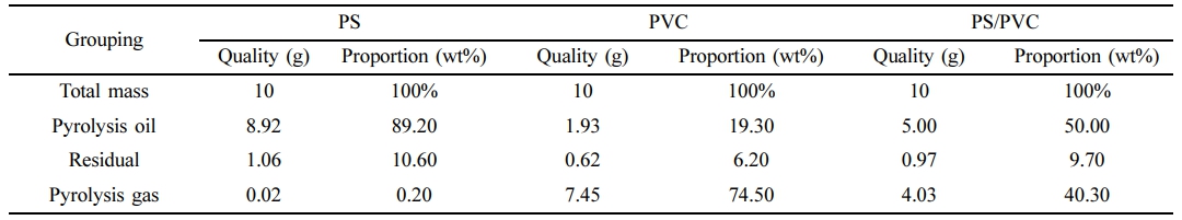 (1) Thermogravimetric analysis demonstrated that the mixture of PS and PVC had a significantly lower initial pyrolysis temperature (256.1 ℃) and termination temperature (483.9 ℃) at a heating rate of 10 ℃/min, compared to the separate pyrolysis of PS and PVC. Additionally, PVC alone exhibited a lower initial pyrolysis temperature (265.7 ℃) and termination temperature (486.6 ℃) than when pyrolyzed individually.