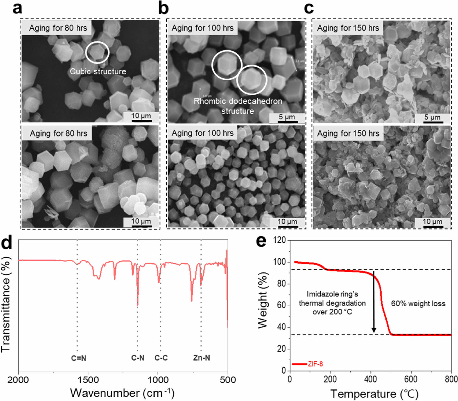Figure 1 SEM images of ZIF-8 aging time: (a) 80 hrs; (b) 100 hrs; (c) 150 hrs; (d) FTIR curve (500-2000 cm-1); (e) TGA graph (0-800 ℃). |