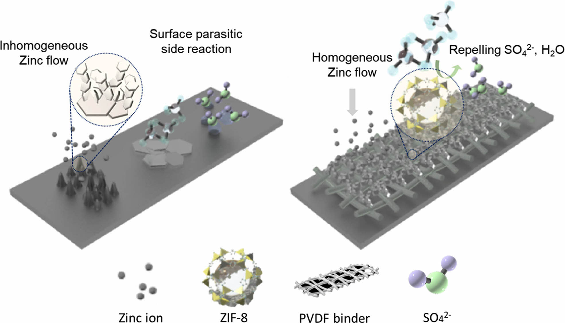 Figure 2 Schematic illustration of prevent side reactions at the electrode/electrolyte interface and inhibition of dendrite formation due to the introduction of the ZIF-8 protective layer. |