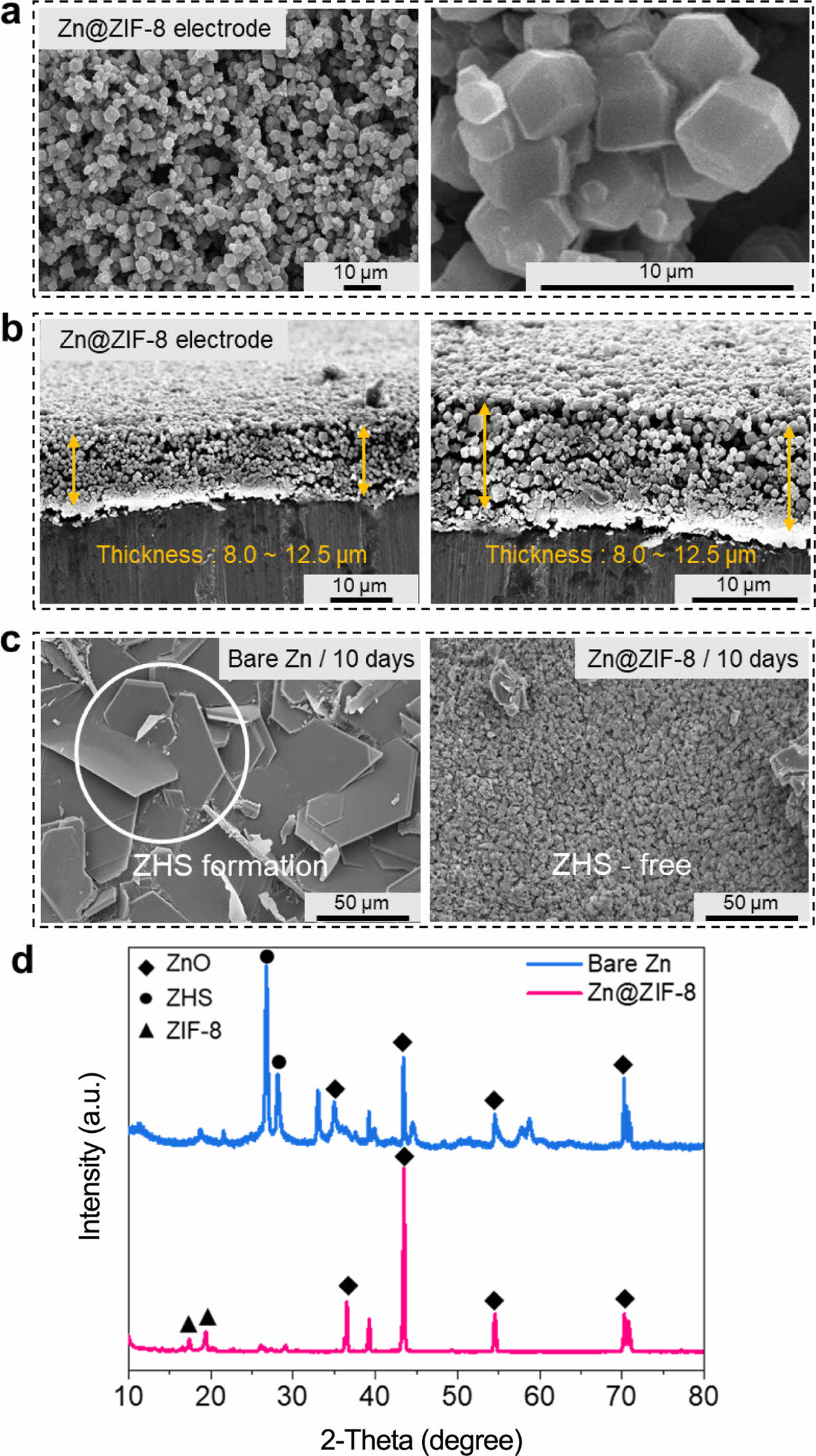 Figure 3 (a) SEM images of Zn@ZIF-8; (b) Cross SEM images of Zn@ZIF-8; (c) Zn@ZIF-8 (After 10 days of ZnSO4 electrolyte immersion); (d) XRD peak of Bare Zn, Zn@ZIF-8 (After 3 days of ZnSO4 electrolyte immersion). |