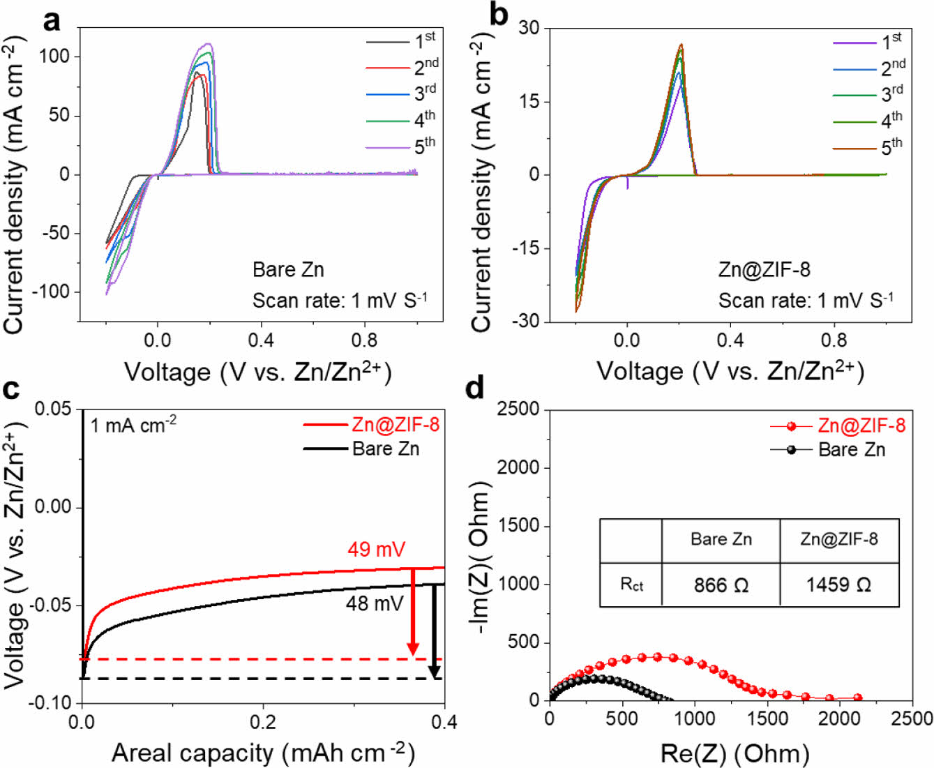 Figure 4 Cyclic voltammetry test: (a) Bare Zn; (b) Zn@ZIF-8; (c) CP test; (d) EIS test of Bare Zn, Zn@ZIF-8 symmetric cell. |