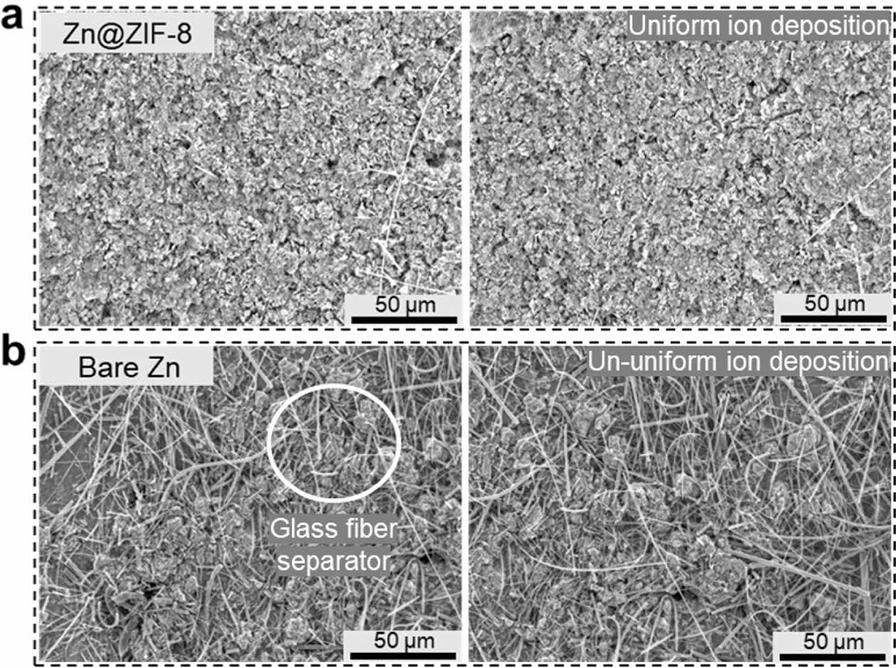 이온 증착 거동 분석. ZIF-8 코팅층은 높은 전류에서도 수상 돌기 성장 제어 및 아연 음극 안정에 기여할 수 있다는 것을 입증하였다. 섬유 형태의 분리막을 제외한 전극 표면에 부착 된 사이클 후 각 전극의 표면에 증착 된 이온의 형상을 비교하였을 때 크고 무작위적으로 자란 일반적인 아연 음극과 달리 미세하고 균일하게 자란 ZIF-8 전극의 SEM 분석 결과를 통해 앞선 ZIF-8 보호층의 이온 증착 형상을 균일하게 유도할 수 있는 효과를 입증하였다(Figure 5(a,b)). 따라서 다기능 ZIF-8 코팅층이 아연 증착 거동을 크게 조절하고 부식을 억제하며 Zn ion flux를 균일하게 유도하여 안정적인 Zn@ZIF-8 음극으로 이어진다는 결론을 내릴 수 있다.